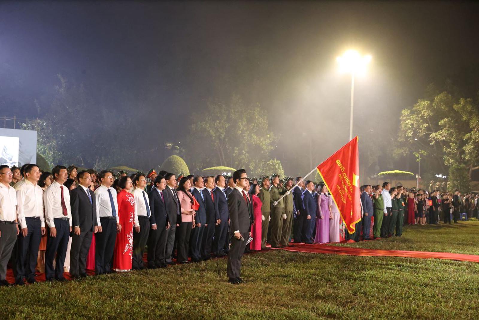 Và trong không khí thiêng liêng, xúc động ấy, cả quảng trường Đoan Môn lắng xuống, tất cả các đại biểu cùng Nhân dân đứng lên hướng về Cột cờ Hà Nội làm lễ chào cờ, tái hiện lại khoảnh khắc thiêng liêng 70 năm về trước, khi đoàn quân trở về giải phóng Thủ đô tổ chức Lễ chào cờ tại Cột cờ Hà Nội.