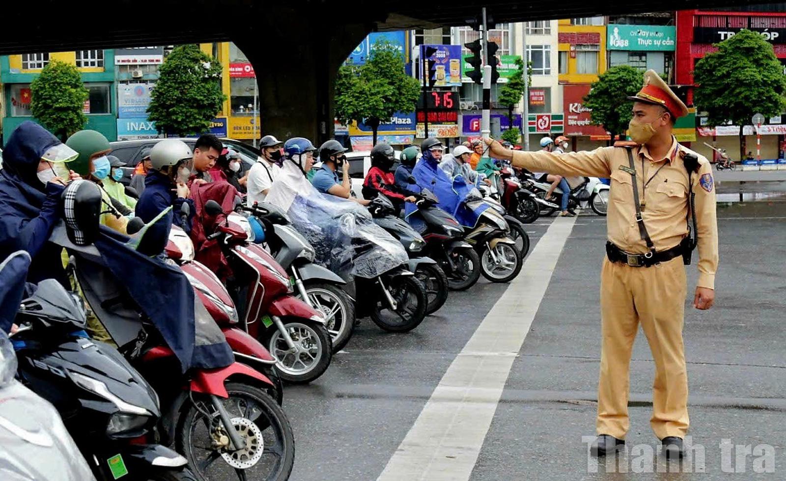 Chiến sĩ Đội 7, Phòng Cảnh sát giao thông Hà Nội không quản nắng mưa phục vụ Nhân dân. Ảnh: TM