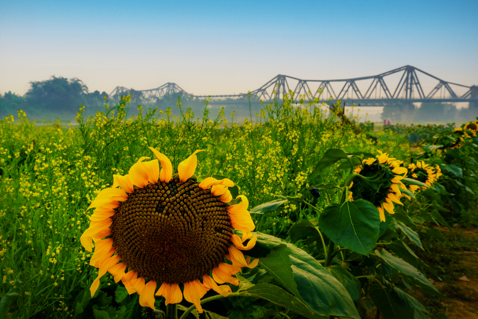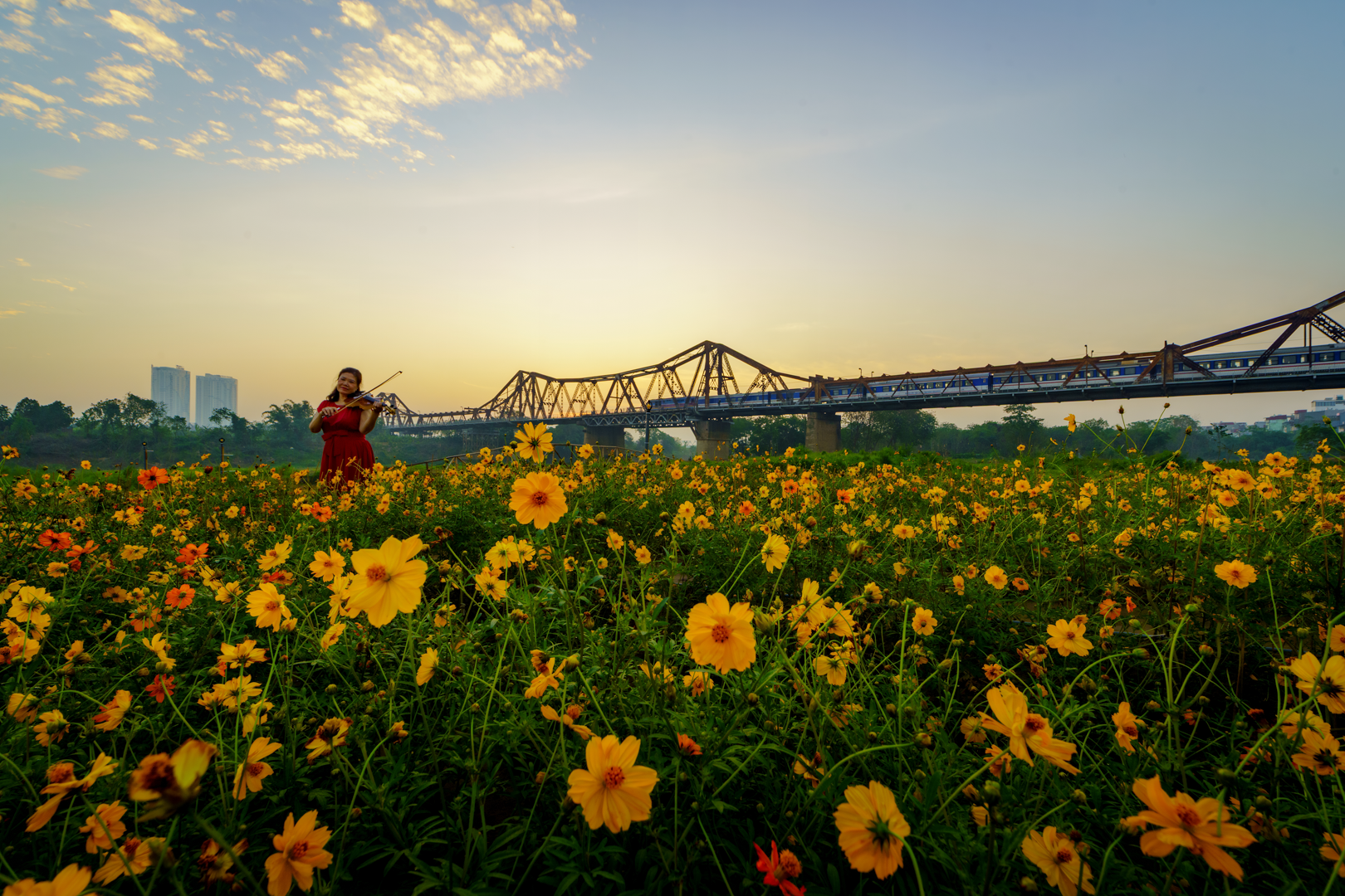 Những ngày này, khu vực bãi ven sông dưới chân cầu Long Biên xuất hiện các thảm hoa cánh bướm, hoa cải vàng, hướng dương nở rộ, góp phần làm thay đổi diện mạo cảnh quan khu vực.