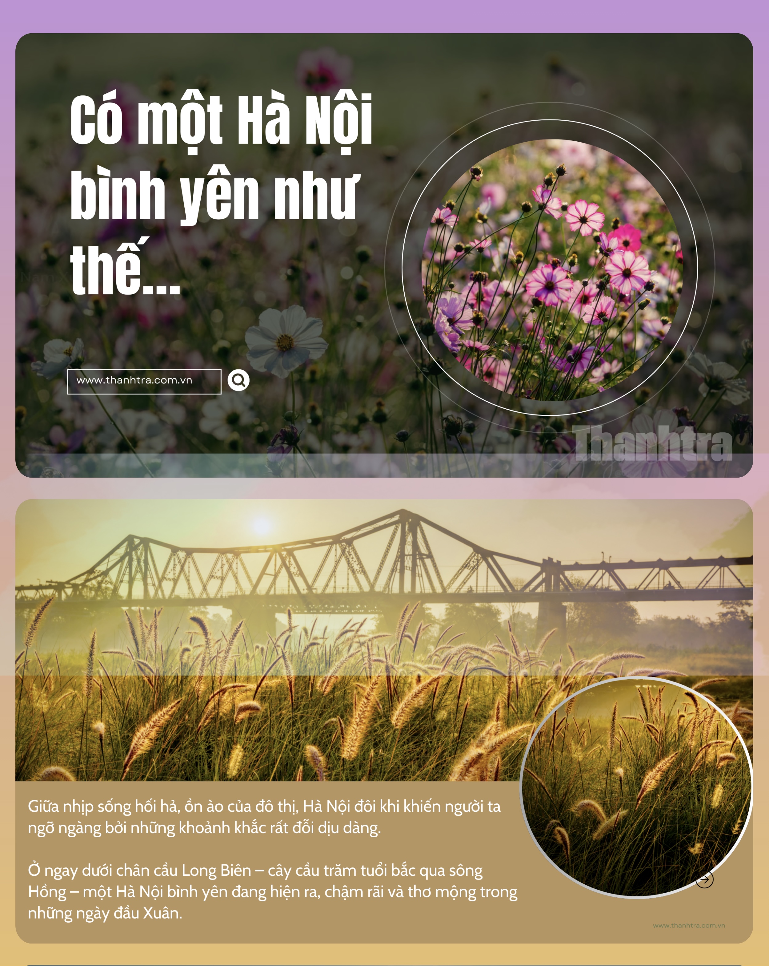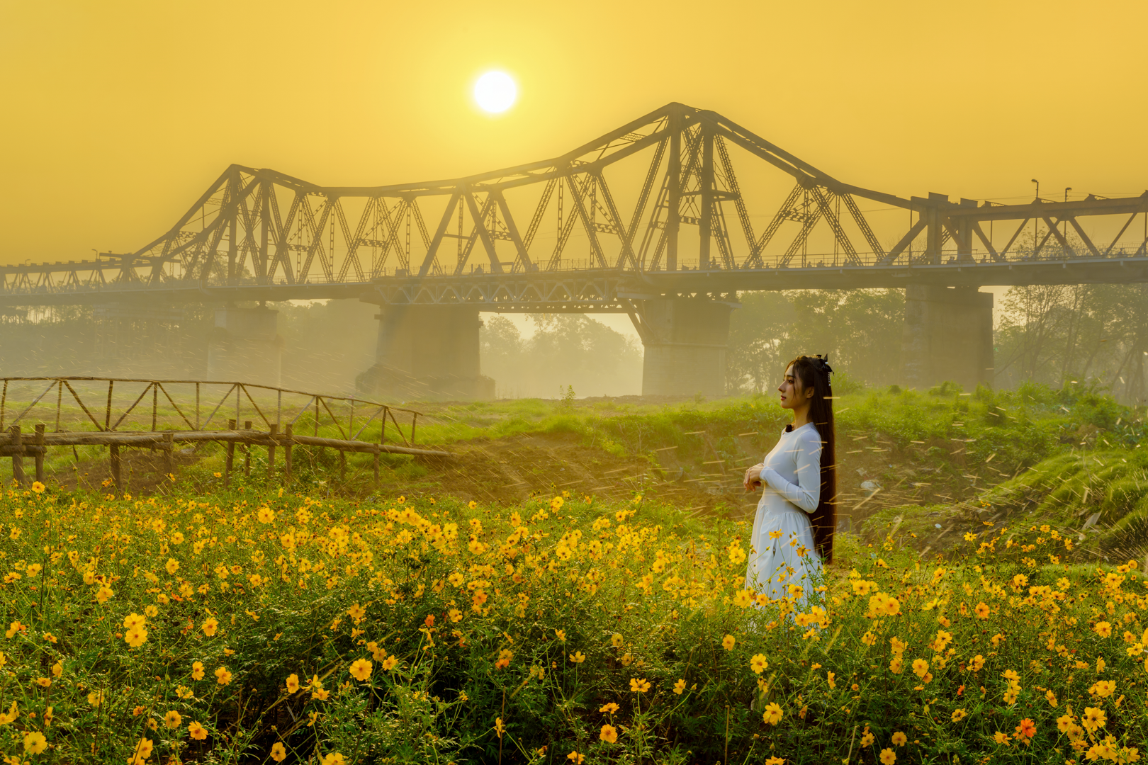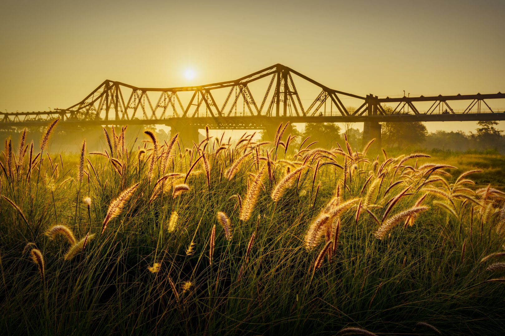 Giữa không gian đó, cầu Long Biên hiện diện như một dấu mốc lịch sử. Sự tương phản giữa cây cầu trăm tuổi và cảnh quan thiên nhiên đang hồi sinh mang lại cảm nhận rõ nét về sự giao thoa giữa quá khứ và hiện tại.