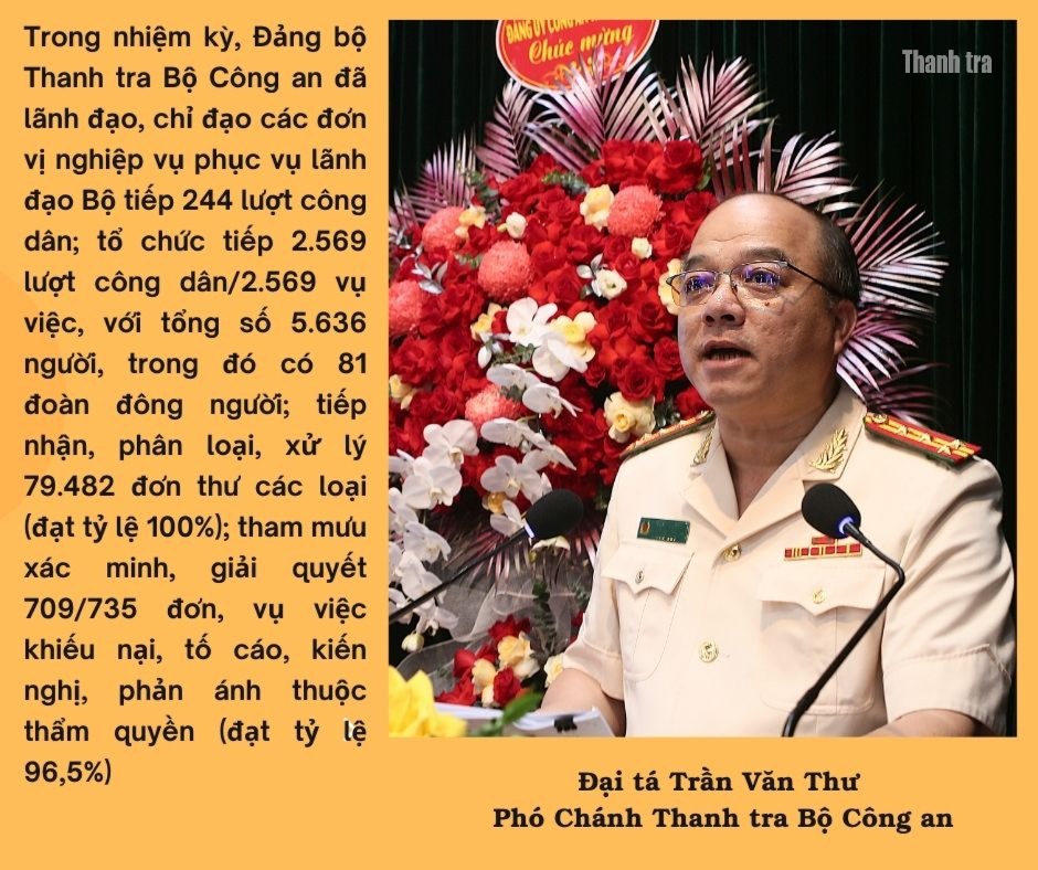 Ghi nhận và biểu dương những kết quả xuất sắc của tập thể Đảng bộ Thanh tra Bộ Công an trong nhiệm kỳ 2020 - 2025, Thượng tướng Trần Quốc Tỏ, Thứ trưởng Bộ Công an, cho rằng Đại hội Đảng bộ Thanh tra Bộ Công an lần thứ X, nhiệm kỳ 2025 - 2030, là một sự kiện chính trị có ý nghĩa đặc biệt quan trọng, và đây cũng là đợt sinh hoạt chính trị sâu rộng để mỗi chúng ta cùng nhau ôn lại và tiếp tục khẳng định về truyền thống, về sự nỗ lực và phát triển không ngừng của các thế hệ cán bộ, chiến sỹ Thanh tra Bộ, 58 năm xây dựng và trưởng thành (1967 - 2025).