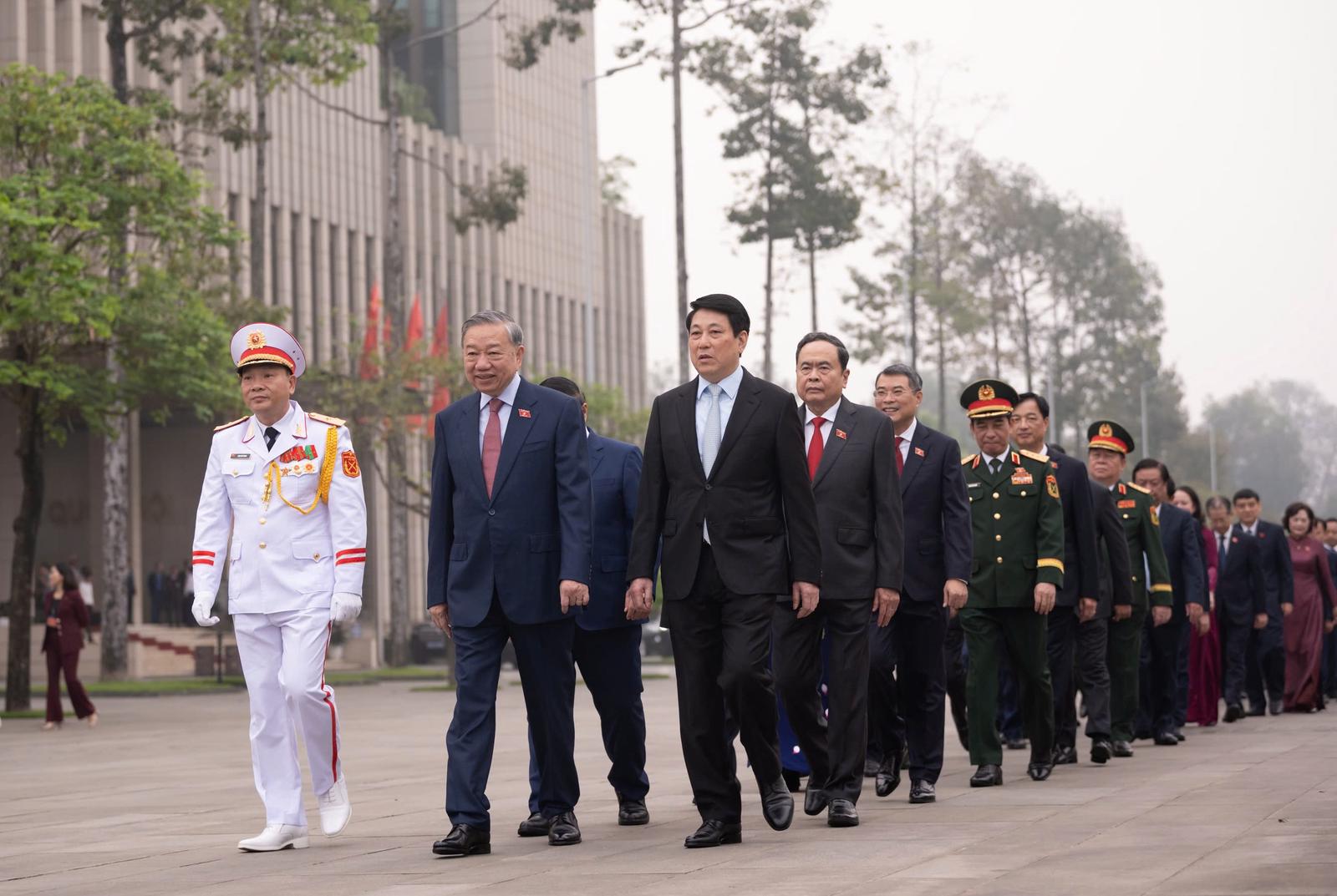 Tham dự Đoàn viếng có Tổng Bí thư Tô Lâm, Chủ tịch nước Lương Cường, Thủ tướng Phạm Minh Chính, Chủ tịch Quốc hội Trần Thanh Mẫn, Thường trực Ban Bí thư Trần Cẩm Tú, Chủ tịch Ủy ban Trung ương Mặt trận Tổ quốc Việt Nam Bùi Thị Minh Hoài.