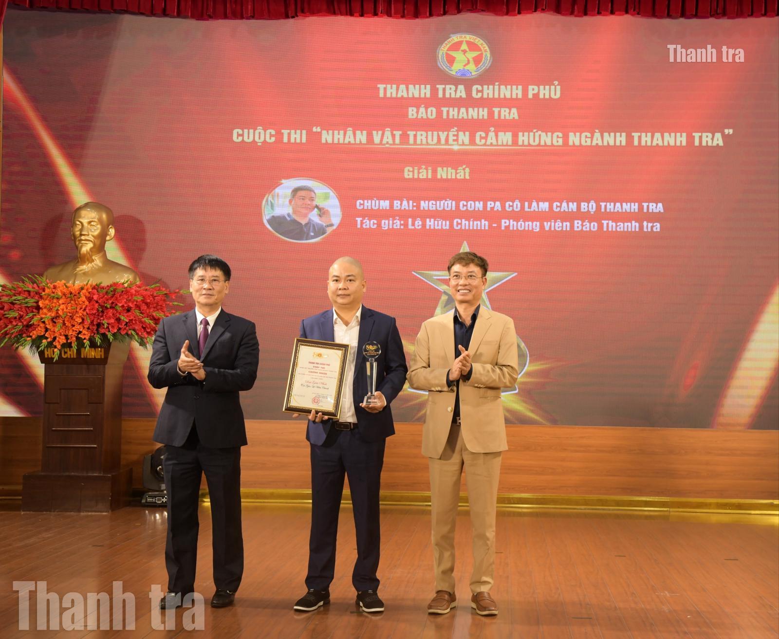Vượt qua hàng trăm bài dự thi, tác phẩm "Người con Pa Cô làm cán bộ thanh tra" kể về nhân vật ông Hồ Anh Tuấn, Phó trưởng Phòng Nghiệp vụ 6, Thanh tra tỉnh Quảng Trị đã được trao giải Nhất. Trong ảnh: Phó Tổng Thanh tra Chính phủ Lê Sỹ Bảy và Tổng Biên tập Báo Thanh tra Nguyễn Tuấn Anh trao giải Nhất cho ông Lê Hữu Chính (Báo Thanh tra).