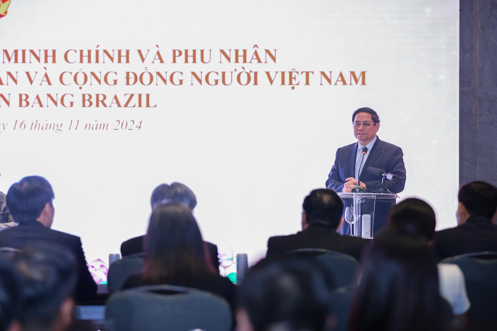 Thủ tướng Phạm Minh Chính bày tỏ vui mừng gặp lại cộng đồng người Việt Nam tại Brazil sau hơn một năm và thay mặt Tổng Bí thư Tô Lâm, Chủ tịch nước Lương Cường, Chủ tịch Quốc hội Trần Thanh Mẫn gửi lời chào trân trọng, lời thăm hỏi ân cần, lời chúc mừng tốt đẹp nhất tới bà con.