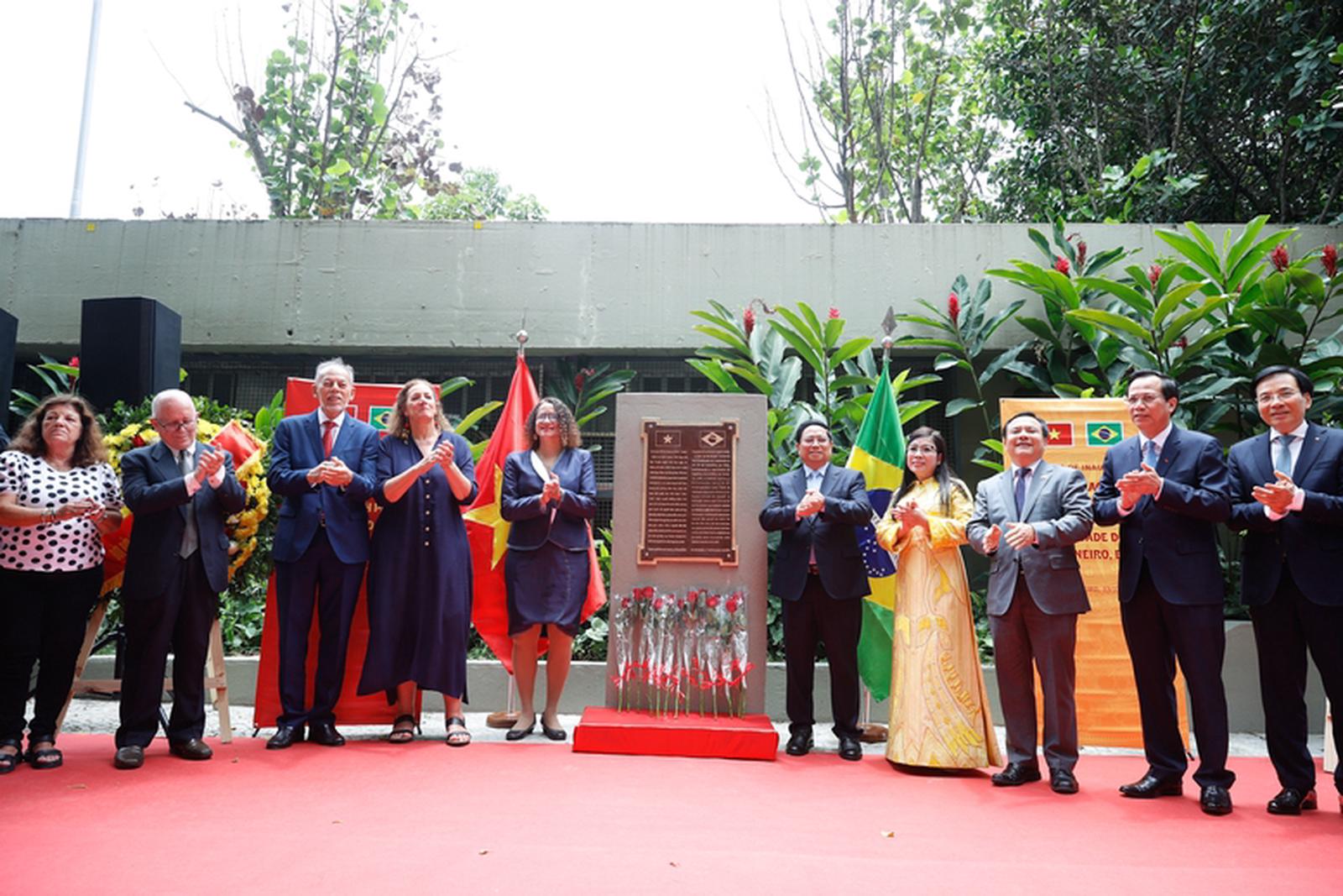 Thủ tướng Phạm Minh Chính và các đại biểu tại lễ khánh thành biển kỷ niệm Chủ tịch Hồ Chí Minh tại thành phố Rio de Janeiro.