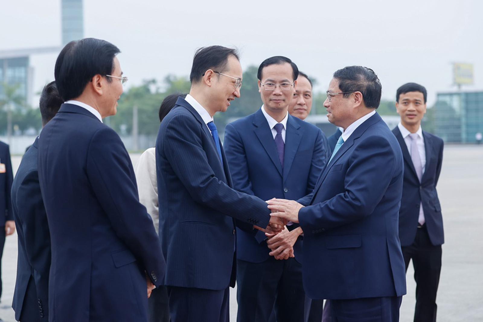 Đón Thủ tướng Phạm Minh Chính và Đoàn Đại biểu cấp cao Việt Nam tại sân bay, về phía Trung Quốc có Ủy viên Thường vụ, Trưởng Ban Tổ chức Tỉnh ủy Vân Nam Lưu Phi; Đại sứ Trung Quốc tại Việt Nam Hà Vĩ; Phó Chủ nhiệm Ban Ngoại vụ tỉnh Vân Nam Mã Tác Hân.