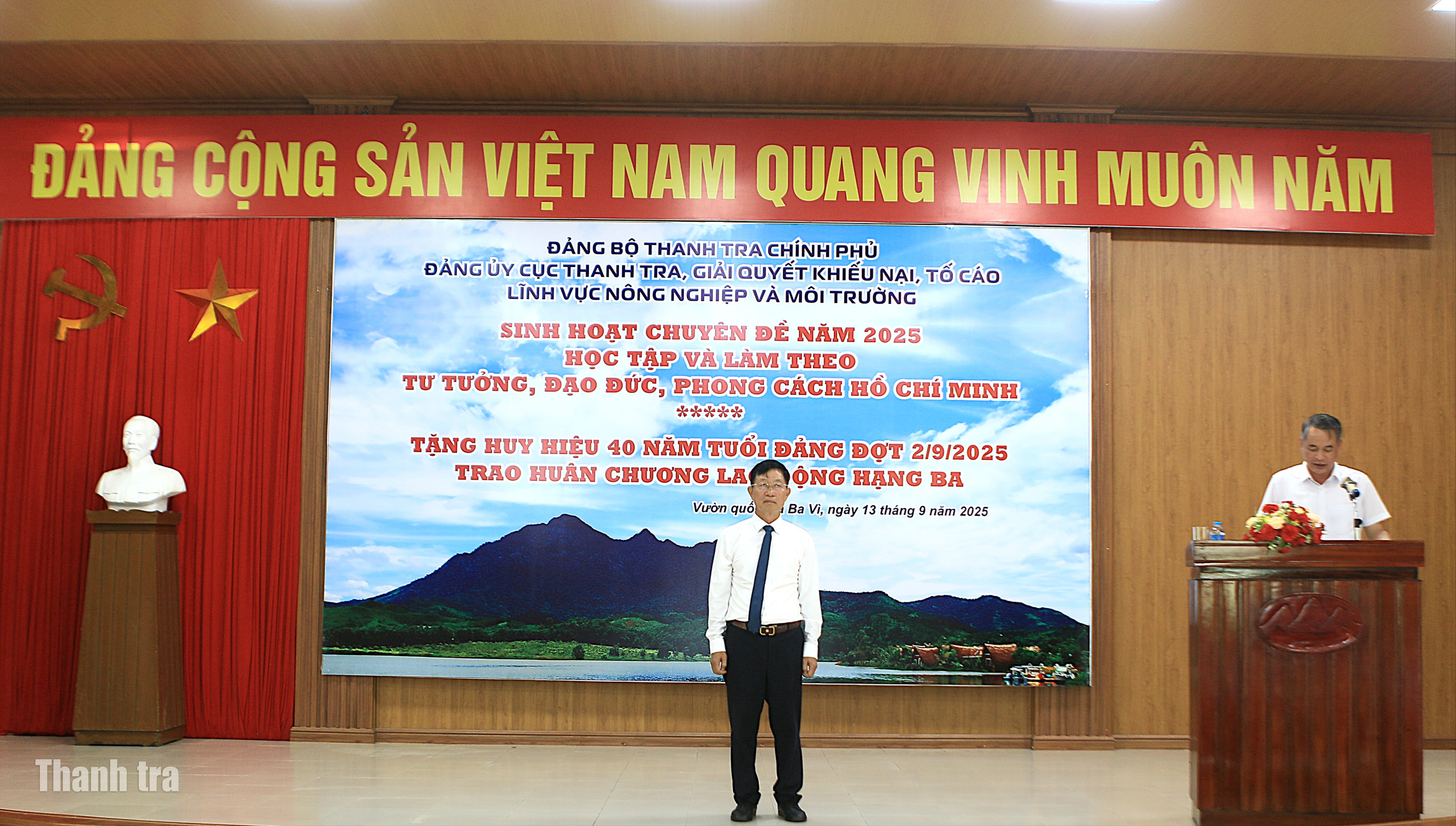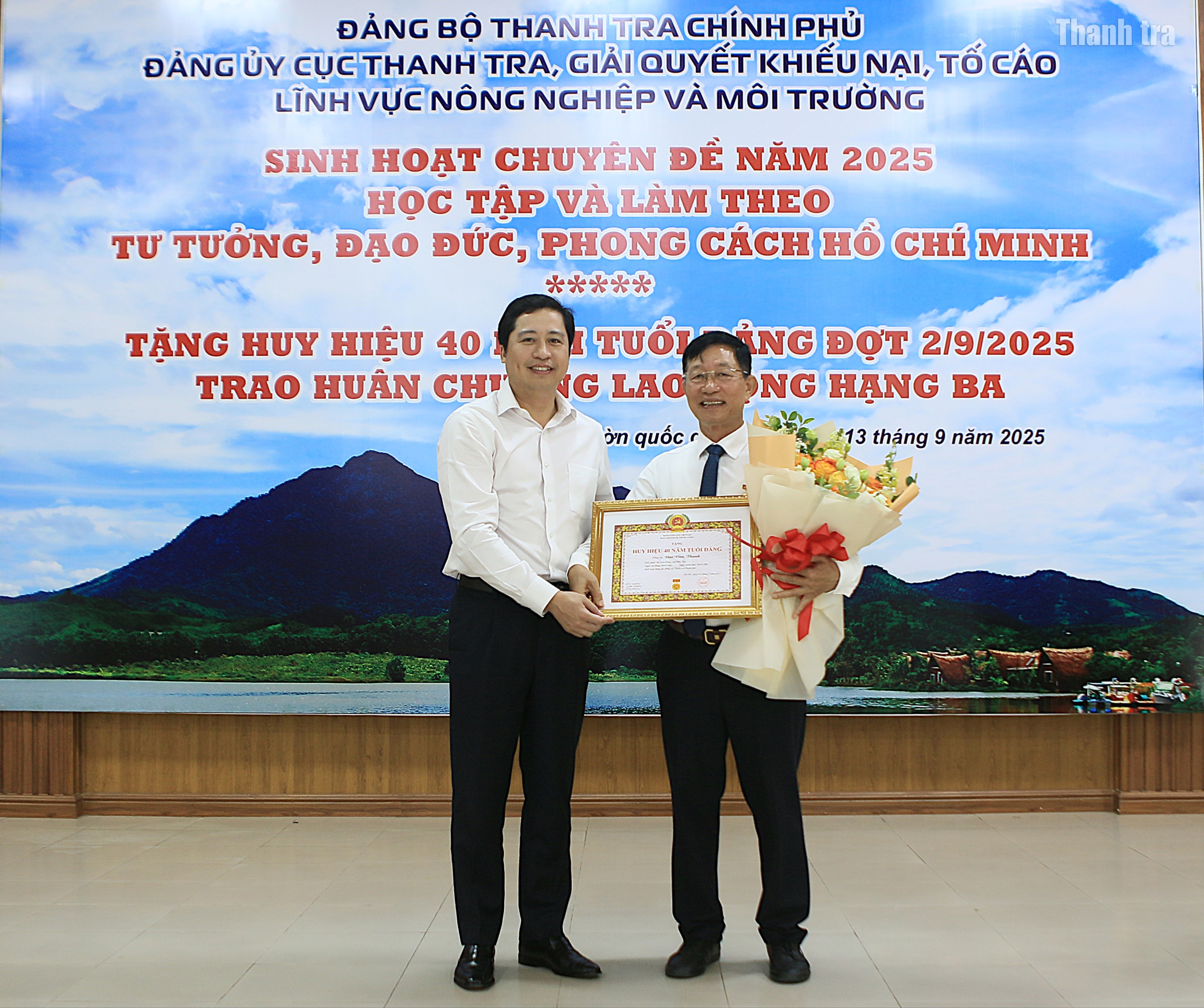 Ngày 13/9, Đảng bộ Cục Thanh tra và giải quyết khiếu nại tố cáo về lĩnh vực tài nguyên và môi trường (Cục VIII), thuộc Đảng bộ Thanh tra Chính phủ, đã tổ chức trao huy hiệu 40 năm tuổi Đảng và Huân chương Lao động hạng Ba cho ông Đào Văn Thanh, Phó Cục trưởng Cục VIII.