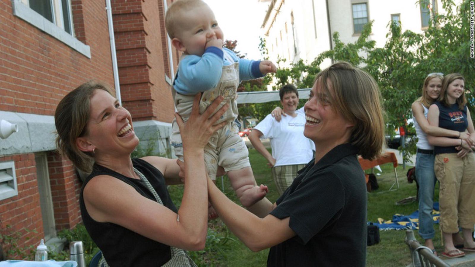 Lara Ramsey, bên trái, và Jane Lohmann đang chơi đùa cùng cậu con trai 7 tháng tuổi, WyattRamsey-Lohmann tại Massachusetts, tiểu bang đầu tiên chấp nhận HNĐG. Ảnh: CNN