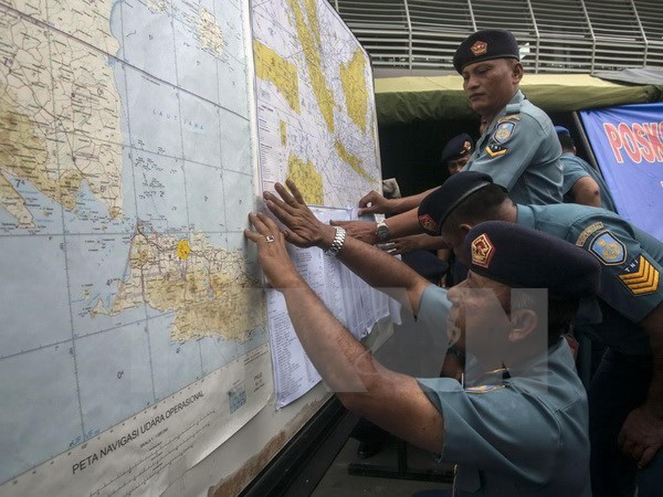 Lực lượng không quân Indonesia thông báo khu vực tìm kiếm máy bay mất tích QZ8501 trong cuộc họp báo tại sân bay Surabaya, Đông Java ngày 29/12. (Nguồn: AFP/TTXVN)