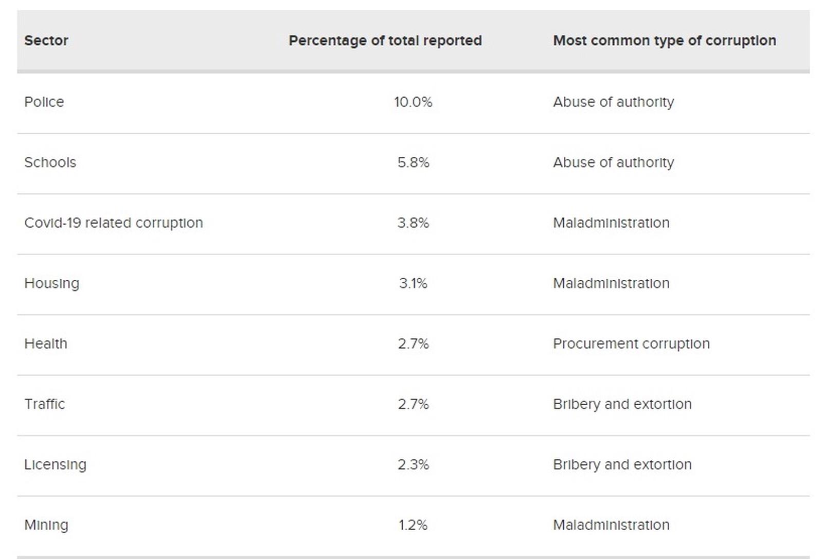 Báo cáo của Tổ chức Giám sát Tham nhũng cũng trình bày chi tiết 8 khu vực được thống kê là có nhiều tham nhũng nhất cũng như 4 hình thức tham nhũng phổ biến nhất. Đứng đầu danh sách là cảnh sát (10%), tiếp đến là trường học (5,8%), với hình thức phổ biến nhất là lạm dụng chức quyền.