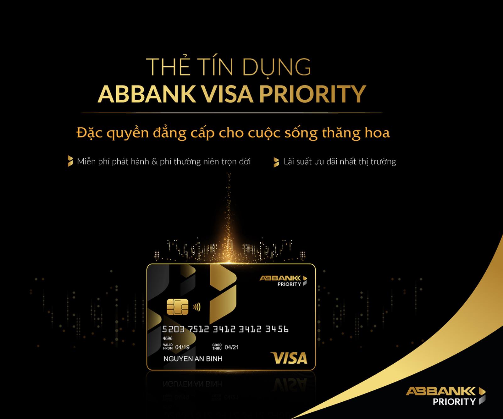 (Thanh tra)- Nhằm đáp ứng nhu cầu về những đặc quyền tiêu dùng đẳng cấp, Ngân hàng TMCP An Bình (ABBANK) vừa ra mắt dòng thẻ tín dụng hạng ưu tiên ABBANK Visa Priority dành cho Khách hàng Ưu tiên, với hạn mức được cấp lên đến 500 triệu đồng, hạn mức chi tiêu tối đa 1 tỷ đồng/ngày và mức lãi suất ưu đãi hấp dẫn.