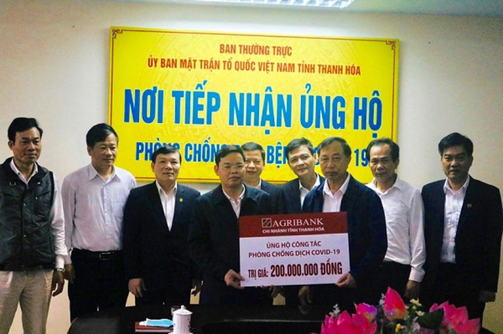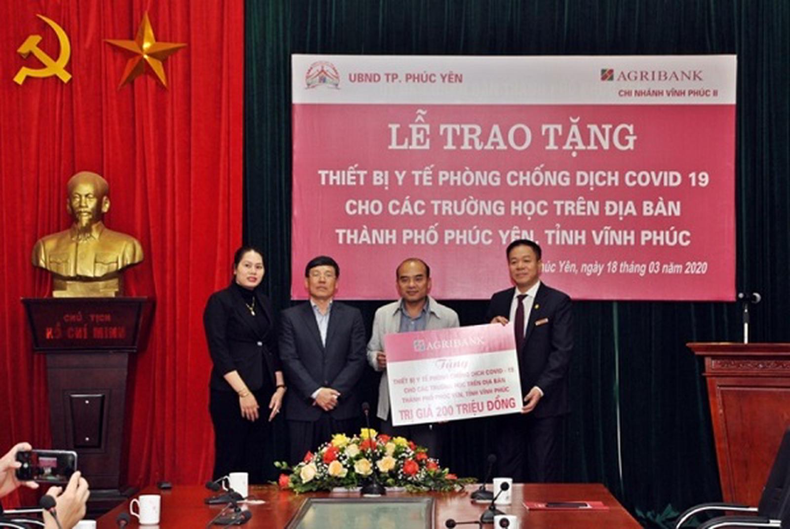 Mới đây, tại lễ phát động toàn dân ủng hộ phòng, chống dịch Covid-19, Agribank đã ủng hộ 10 tỷ đồng chung tay phòng, chống dịch bệnh. Không chỉ dừng lại ở con số này, hành trình ủng hộ của Agribank vẫn tiếp tục nối dài trên khắp cả hệ thống. Thực hiện lời kêu gọi của Chủ tịch Uỷ ban Trung ương Mặt trận Tổ quốc Việt Nam và Chủ tịch Ủy ban Mặt trận Tổ quốc các địa phương về phát động toàn dân chung tay phòng chống dịch Covid-19, các chi nhánh Agribank trên địa bàn tỉnh Thanh Hóa, Bắc Giang, Hưng Yên, Đà Nẵng… đã trao hơn 600 triệu đồng cho Uỷ ban Mặt trận Tổ quốc và các cơ sở y tế tại địa phương nhằm ủng hộ công tác phòng chống dịch Covid-19. Agribank Vĩnh Phúc II trao tặng 130 máy đo thân nhiệt với tổng trị giá 200 triệu đồng cho các trường học trên địa bàn thành phố Phúc Yên…