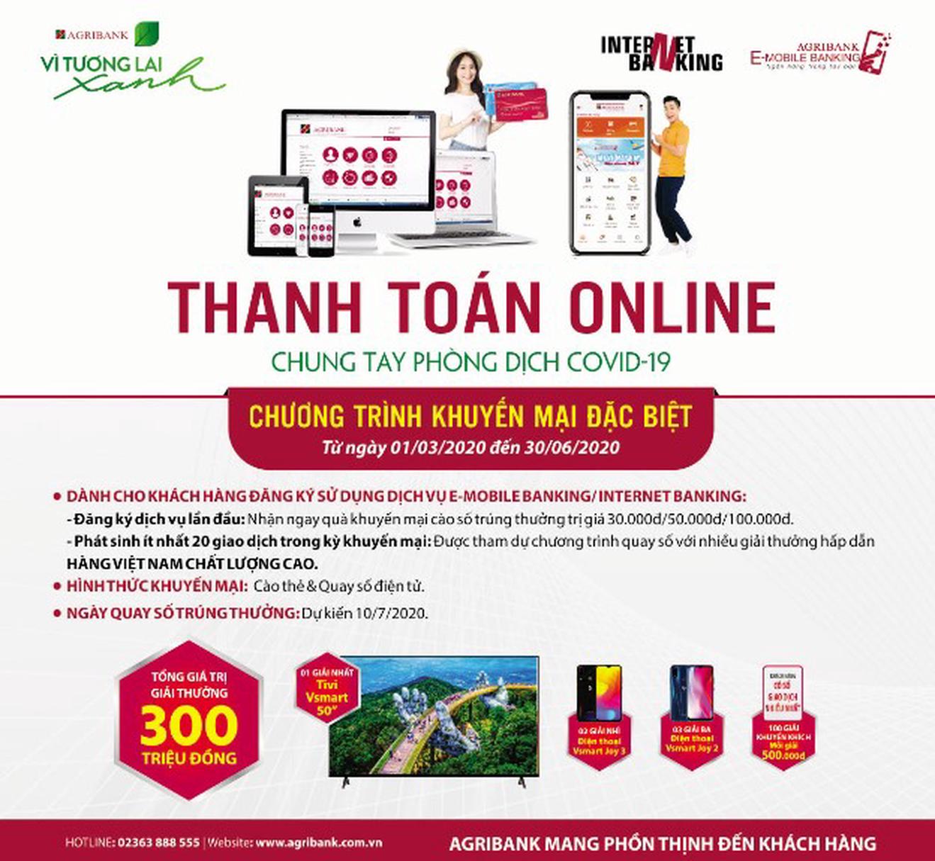 (Thanh tra) - Từ ngày 01/3/2020 đến hết ngày 30/6/2020, khách hàng đăng ký mới sử dụng dịch vụ Agribank E-Mobile Banking hoặc Agribank Internet Banking tại Agribank Chi nhánh Đà Nẵng sẽ được tham gia chương trình khuyến mại: “Thanh toán online, chung tay phòng dịch Covid-19” để có cơ hội trúng thưởng Smart Tivi và Smart Phone, và các giải thưởng có giá trị khác, với tổng giá trị giải thưởng lên đến 300 triệu đồng.