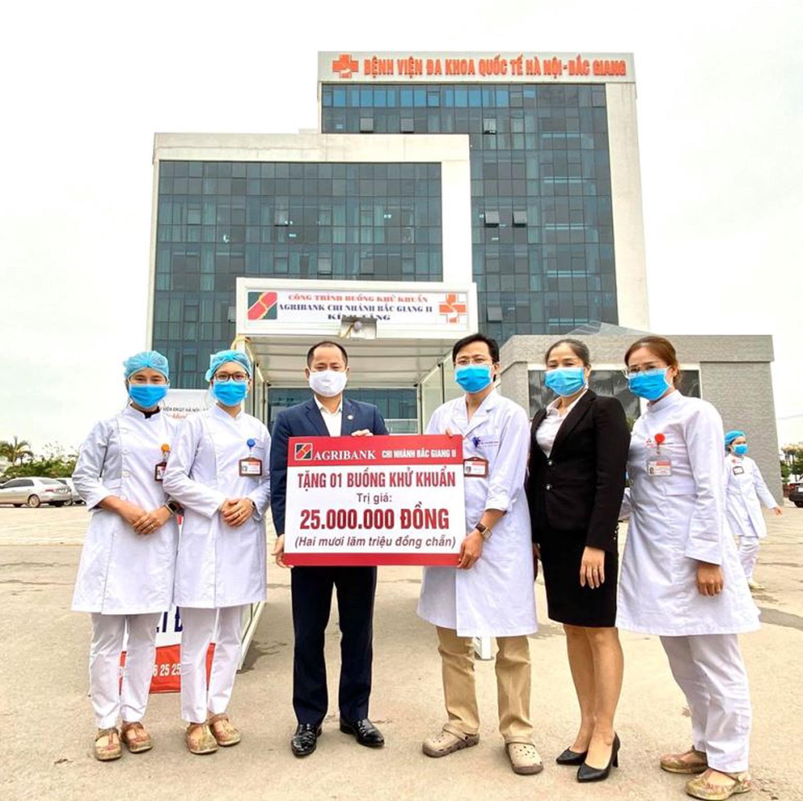 Tiếp tục chung tay phòng chống dịch COVID-19, Agribank Chi nhánh Bắc Giang II tài trợ 03 buồng khử khuẩn toàn thân trị giá 25.000.000đ/buồng cho Bệnh viện Đa khoa tỉnh Bắc Giang, Bệnh viện Sản nhi Bắc Giang và Bệnh viện Đa khoa Quốc tế Hà Nội - Bắc Giang.