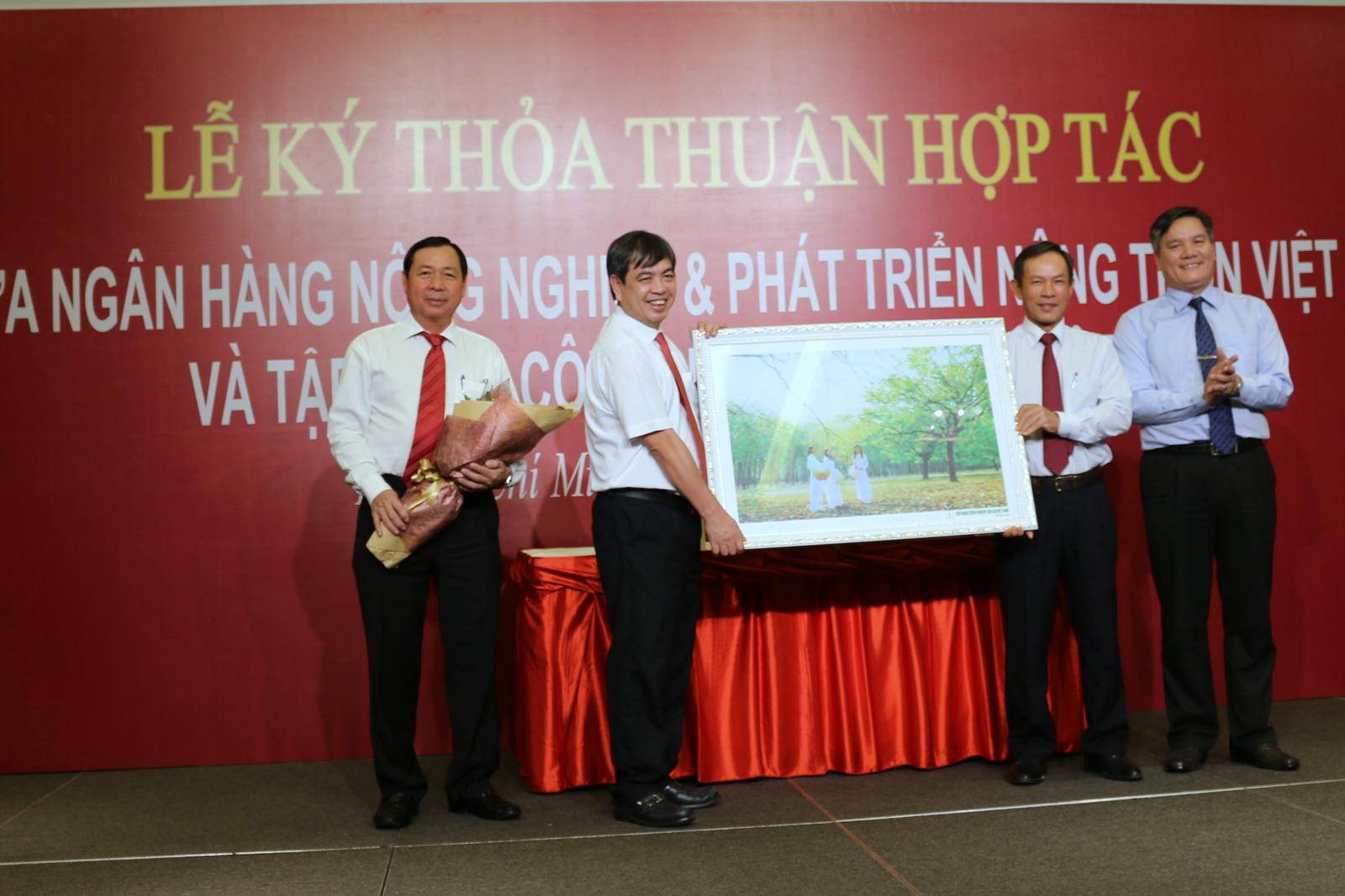 Chủ tịch HĐTV Agribank - ông Trịnh Ngọc Khánh (thứ 2 từ bên trái) tặng quà lưu niệm Chủ tịch HĐTV VRG - ông Võ Sỹ Lực
