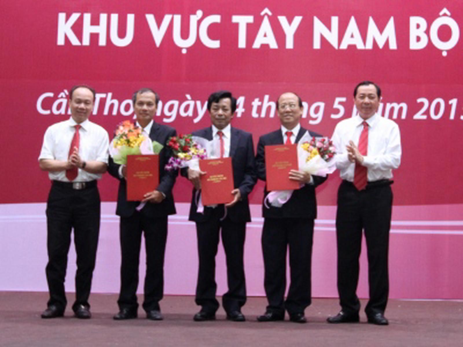 Ông Tiết Văn Thành - Thành viên HĐTV, TGĐ Agribank (ngoài cùng bên phải) và ông Nguyễn Minh Trí - Thành viên HĐTV Agribank (ngoài cùng bên trái) trao quyết định bổ nhiệm Ban lãnh đạo VPĐD KV Tây Nam bộ Agribank