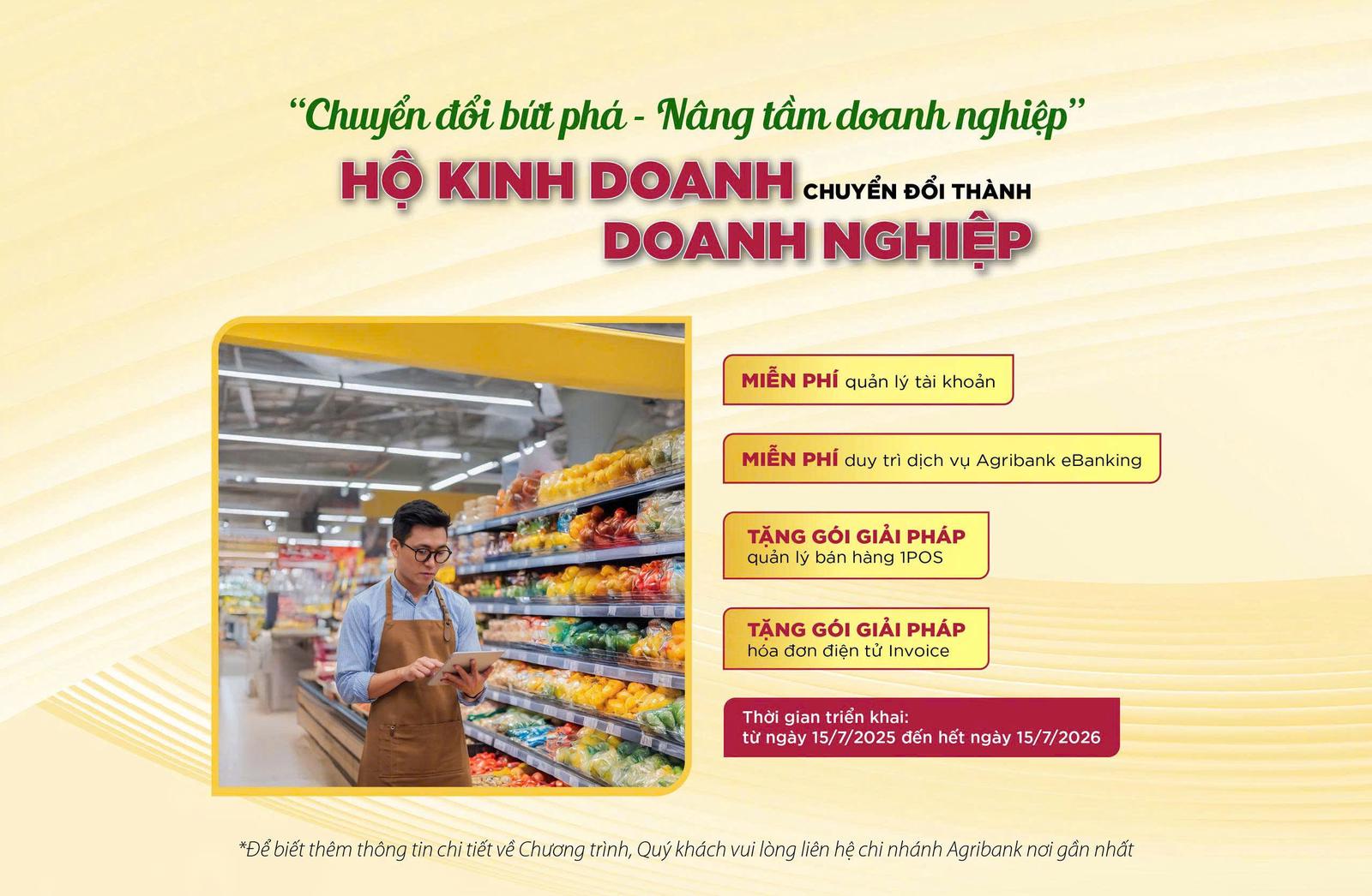 Là ngân hàng thương mại hàng đầu, Agribank luôn xác định rõ vai trò tiên phong trong thực thi các chỉ đạo, chính sách của Đảng, Nhà nước. Đồng hành, hỗ trợ các hộ kinh doanh cá thể chuyển đổi mô hình hoạt động và nâng cao năng lực cạnh tranh theo Nghị định 70/2025, Agribank triển khai chương trình ưu đãi “Chuyển đổi bứt phá - Nâng tầm doanh nghiệp”. Chương trình diễn ra từ ngày 15/7/2025 đến hết ngày 15/7/2026, dành cho hộ kinh doanh thực hiện chuyển đổi thành doanh nghiệp từ ngày 1/1/2025 và doanh nghiệp lần đầu mở tài khoản thanh toán tại Agribank.