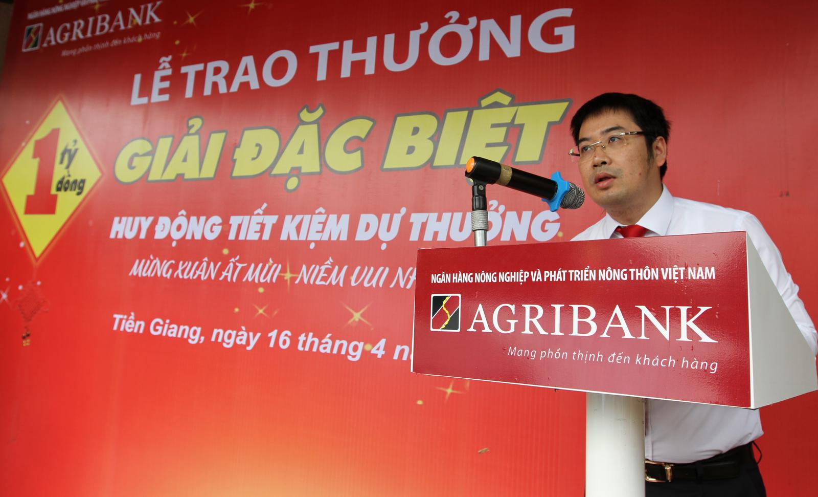 Sáng 16/4/2015, tại Tp. Mỹ Tho - tỉnh Tiền Giang, Agribank tổ chức Lễ trao giải đặc biệt thứ nhất cho khách hàng trúng thưởng trong đợt huy động tiết kiệm dự thưởng "Mừng xuân Ất Mùi - Niềm vui nhân đôi". Người may mắn trúng giải đặc biệt - sổ tiết kiệm linh hoạt trị giá 1 tỷ đồng là ông Bùi Công Thành - khách hàng gửi tiền tại Agribank chi nhánh tỉnh Tiền Giang.
