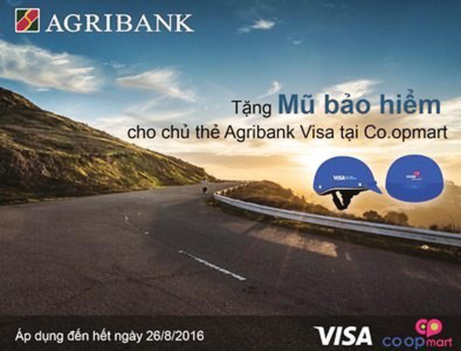 Từ nay đến hết ngày 26/8/2016, quý khách hàng là chủ thẻ Agribank Visa thực hiện mua sắm hàng hóa tại siêu thị Co.opmart vào các ngày thứ hai, thứ ba, thứ tư hàng tuần sẽ có cơ hội nhận ngay 1 phần quà hấp dẫn là mũ bảo hiểm Co.opmart.