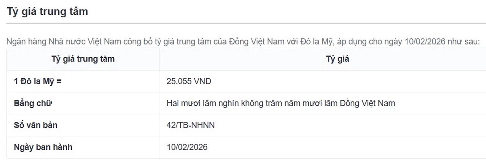 Tỷ giá trung tâm công bố ngày 10/2 (Ảnh: SBV).