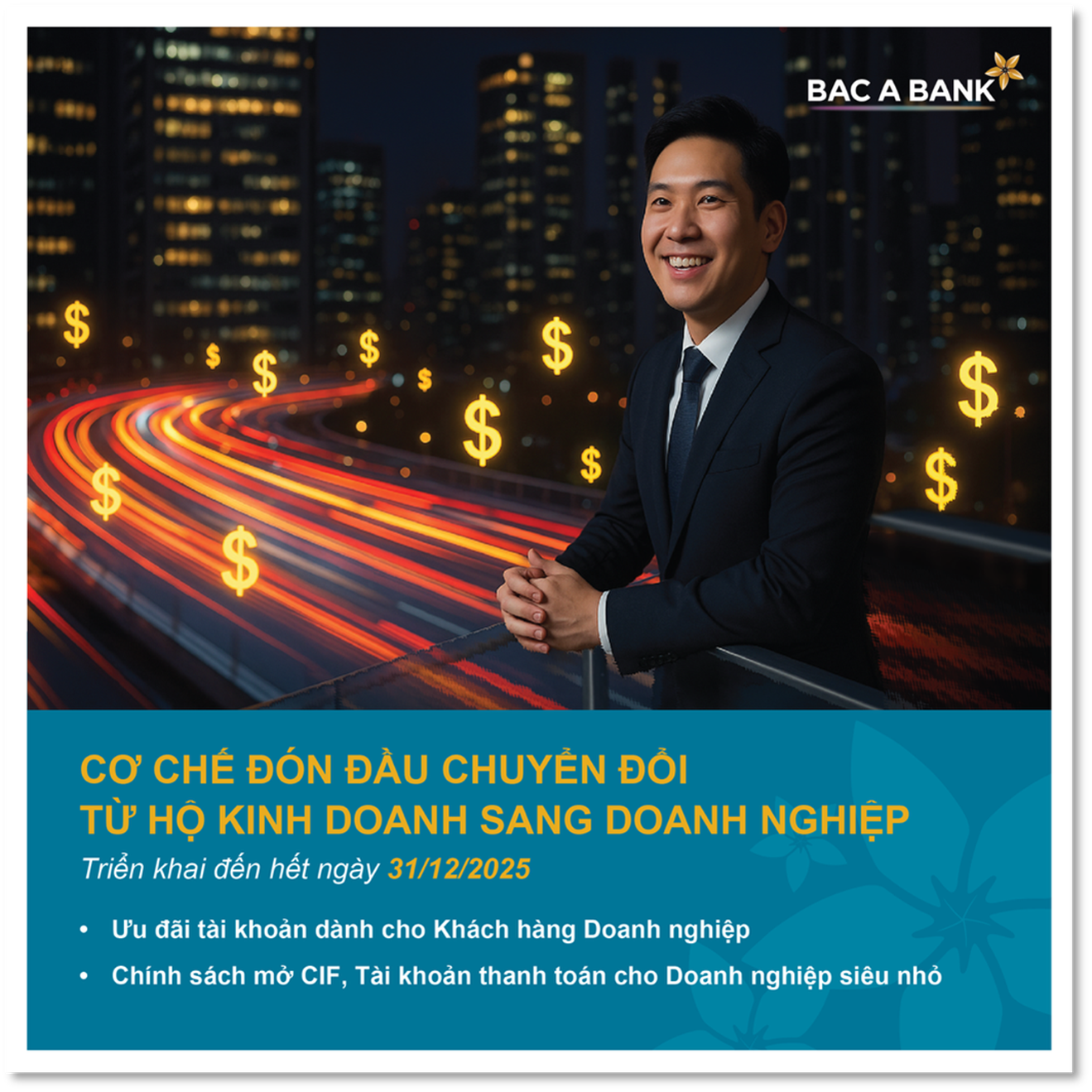 (Thanh tra) - Nhằm đồng hành cùng các tiểu thương và hộ kinh doanh trong hành trình chuyển đổi mô hình hoạt động, tuân thủ các quy định mới về nghĩa vụ tài chính, Ngân hàng TMCP Bắc Á (BAC A BANK) chính thức giới thiệu “Cơ chế đón đầu chuyển đổi từ Hộ kinh doanh sang Doanh nghiệp”.