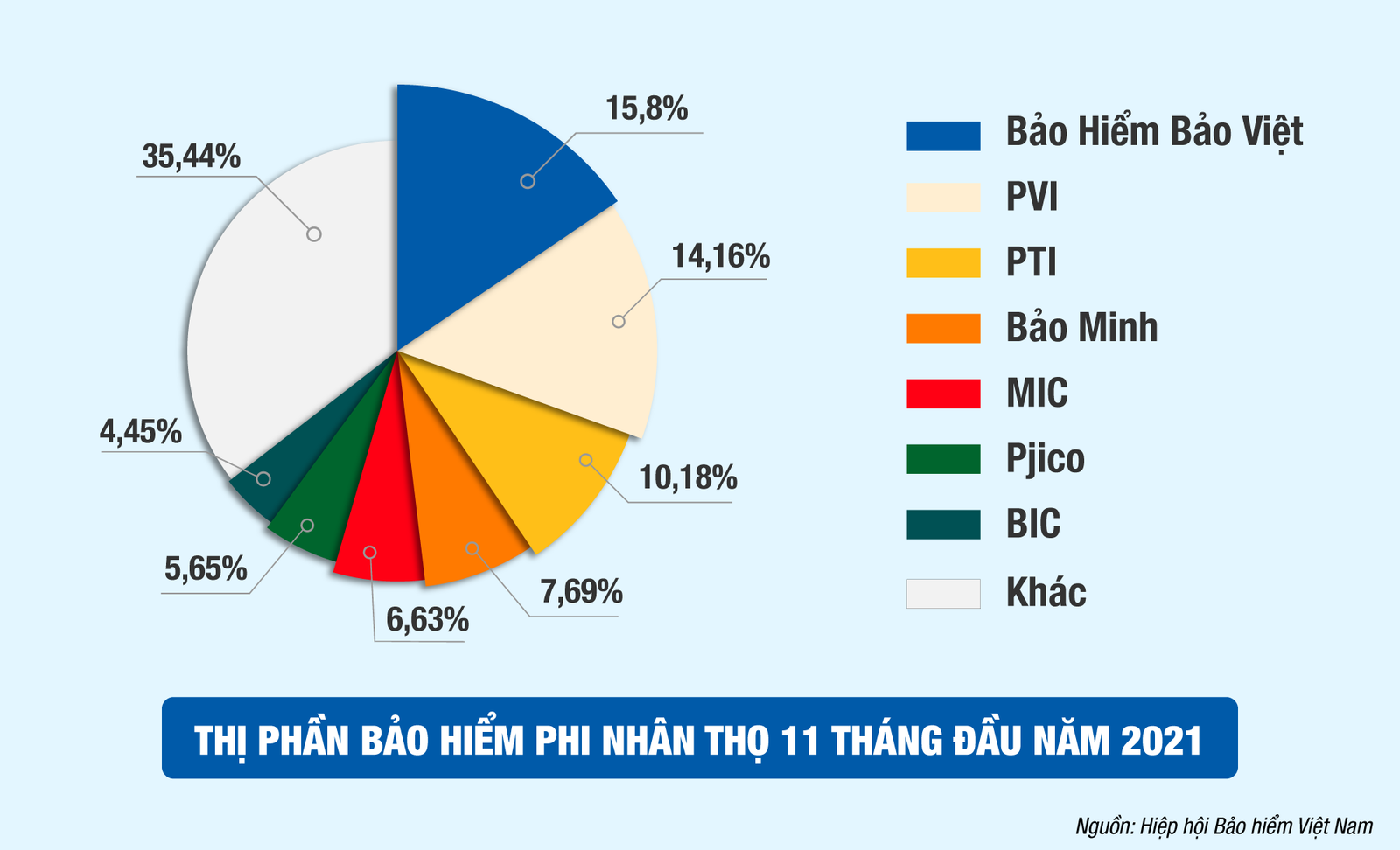 Khẳng định vai trò tiên phong và dẫn dắt trên thị trường, tính đến hết tháng 11/2021, tổng Doanh thu phí của Bảo hiểm Bảo Việt đạt hơn 8.149 tỷ đồng với thị phần lớn nhất thị trường 15,8% (theo Hiệp hội Bảo hiểm Việt Nam). Đứng trước những thách thức đến từ đại dịch Covid-19, thực hiện tốt mục tiêu kép của Chính phủ, Bảo hiểm Bảo Việt đã nhanh chóng thích ứng với tình hình mới, ra mắt các chương trình bảo hiểm mới đa dạng phù hợp với nhu cầu khách hàng; mở rộng các kênh phân phối, đặc biệt là kênh trực tuyến, kênh tư vấn bảo hiểm; từ đó xây dựng hệ sinh thái số toàn diện để mang lại những tiện ích ngày một thuận lợi hơn cho khách hàng và đối tác. Vị trí thứ hai thuộc về PVI với doanh thu hơn 7.500 tỷ đồng, chiếm 14,6% thị phần; PTI đứng vị trí thứ ba với 5.250 tỷ đồng, chiếm 10,18% thị phần, tiếp đến là Bảo Minh với gần 4.000 tỷ đồng và 7,69% thị phần, vị trí tiếp còn lại trong Top 5 là MIC với 3.418 tỷ đồng và 6,63% thị phần.