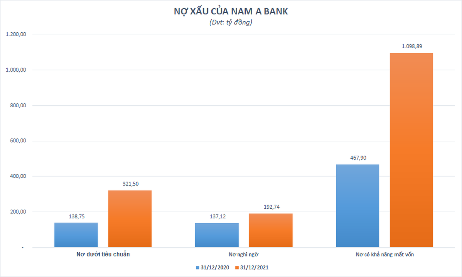 Tính đến cuối năm 2021, tổng tài sản ngân hàng tăng 14,1% so với đầu năm lên 153.238 tỷ đồng. Trong đó, dư nợ cho vay khách hàng tăng 15,1% đạt gần 102.653 tỷ đồng. Đáng chú ý, chất lượng dư nợ của Nam A Bank lại đi xuống rõ rệt, tổng nợ xấu thời điểm 31/12/2021 tăng đột biến gấp 2,2 lần đầu năm, qua đó đẩy tỷ lệ nợ xấu trên dư nợ vay từ 0,83% lên 1,57%.
