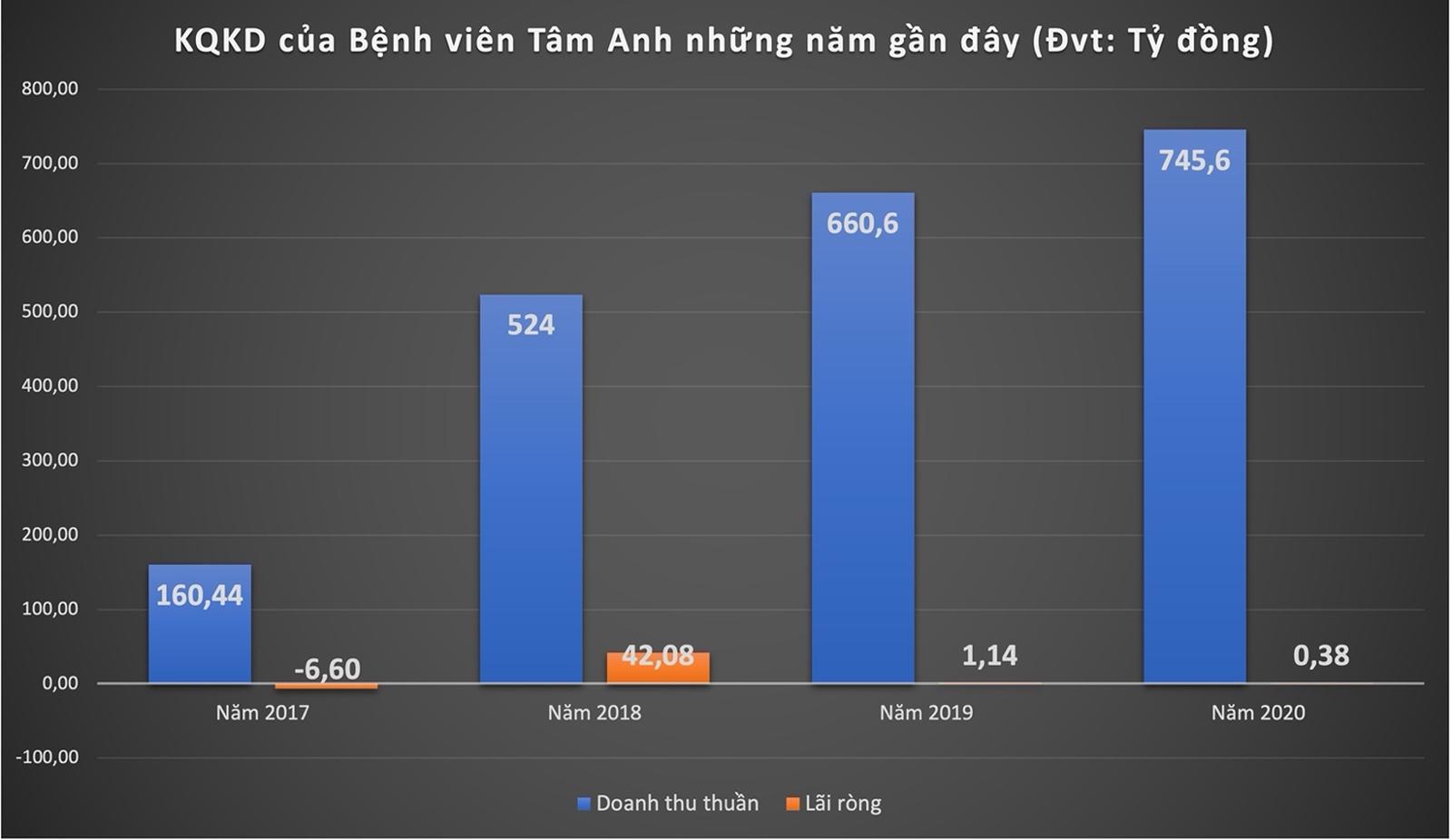 Cụ thể, chỉ trong bốn năm gần nhất, từ 2017 đến 2020, doanh thu của Bệnh viện Tâm Anh tăng vọt từ 160 tỷ lên hơn 745 tỷ đồng. Tuy nhiên, lợi nhuận trong hai năm gần nhất chỉ quanh ngưỡng 1 tỷ đồng. Tỷ suất sinh lời thấp đến mức khó tin với lĩnh vực y tế tư nhân.