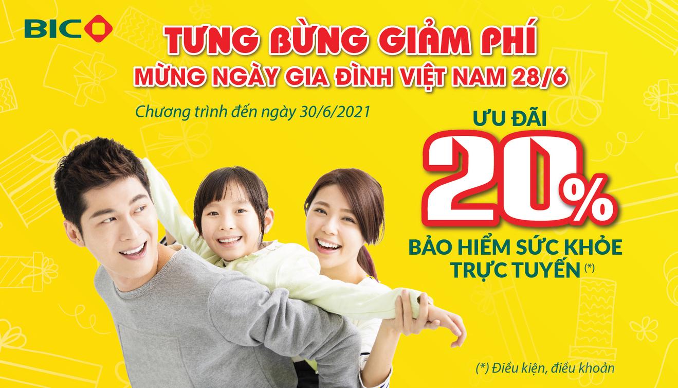 (Thanh tra)- Chào mừng ngày gia đình Việt Nam 28/6, từ nay đến hết ngày 30/6/2021, Tổng Công ty Bảo hiểm BIDV (BIC) gửi tặng khách hàng chương trình ưu đãi giảm phí hấp dẫn khi mua bảo hiểm sức khỏe trực tuyến.