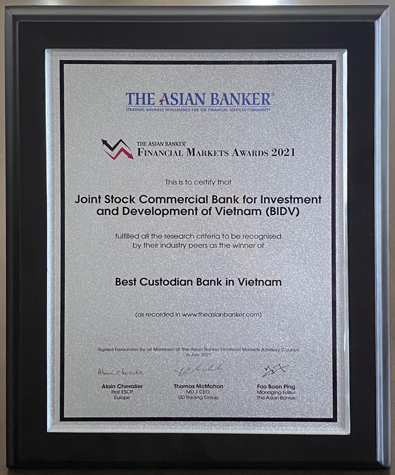 Giải thưởng “Best Custodian Bank” được đánh giá độc lập, kéo dài hơn 3 tháng bởi các chuyên gia, các nhà nghiên cứu, đánh giá hơn 250 tổ chức tài chính ở khu vực châu Á Thái Bình Dương. Tiêu chí đánh giá bao gồm: đánh giá hiệu quả hoạt động, nền tảng công nghệ, dịch vụ cung cấp và phương pháp quản lý rủi ro trong việc quản lý, lưu ký và giám sát tài sản khách hàng và các giải pháp ứng phó với đại dịch Covid-19. Giải thưởng ghi nhận những nỗ lực và thành tích của BIDV trong việc bắt kịp xu hướng thị trường, cung cấp dịch vụ toàn diện và khả năng tự chủ của hệ thống công nghệ. Giải thưởng này một lần nữa củng cố vị thế số 1 của BIDV trong số các ngân hàng lưu ký - giám sát nội địa.