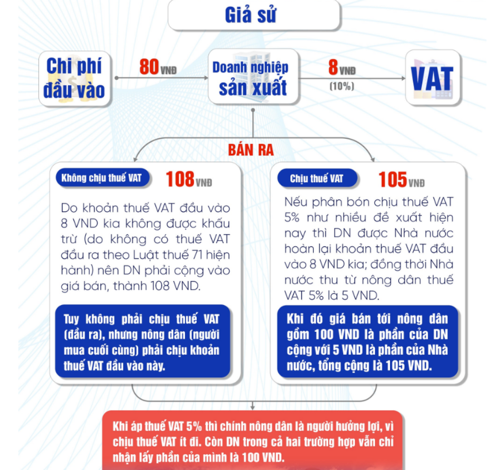 Ở trường hợp áp thuế suất GTGT 5% theo giả thuyết trên là 5 đồng, thuế GTGT đầu vào vẫn là 8 đồng, do chính sách được hoàn thuế, doanh nghiệp sản xuất phân bón trong nước sẽ có 8 đồng đầu vào được khấu trừ với 5 đồng đầu ra và được hoàn lại 3 đồng. Khi đó, giá bán của sản phẩm phân bón là 105 đồng và lợi nhuận của doanh nghiệp vẫn bảo đảm 20 đồng.