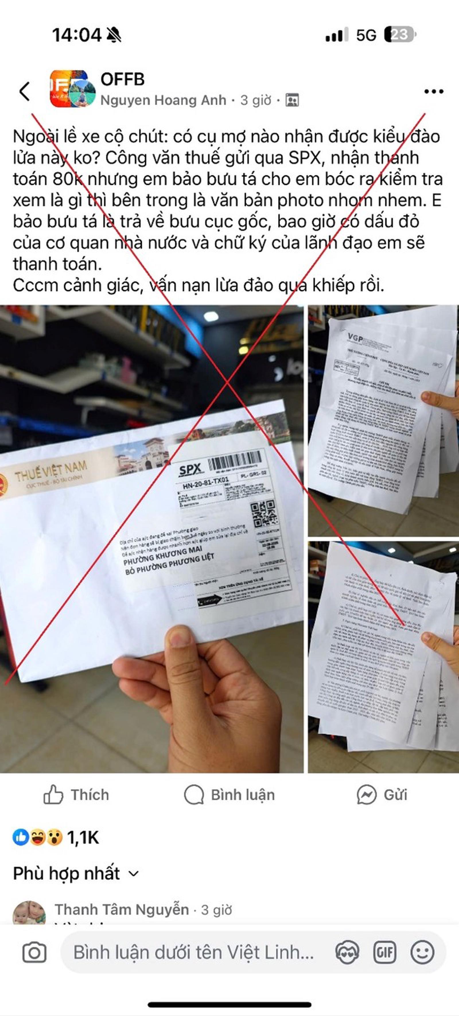 Theo Cục Thuế, hiện nay, trên nền tảng mạng xã hội Facebook xuất hiện thông tin cho rằng “Cục Thuế gửi công văn qua SPX, nhận thanh toán 80k, khi bóc ra bên trong có chứa văn bản photocopi của cơ quan nhà nước…”.