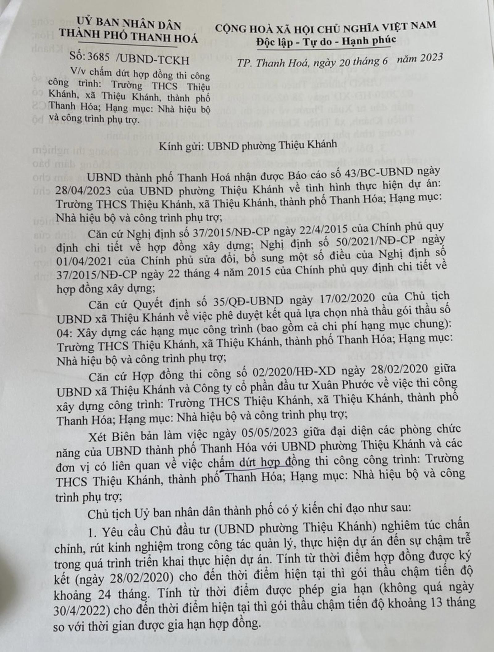 Chủ tịch UBND TP Thanh Hoá Trịnh Huy Triều đã có văn bản về việc chấm dứt hợp đồng công trình Trường THCS Thiệu Khánh, TP Thanh Hoá; với các hạng mục: Nhà hiệu bộ và công trình phụ trợ giữa UBND phường Thiệu Khánh (chủ đầu tư) và Công ty Xuân Phước (nhà thầu).