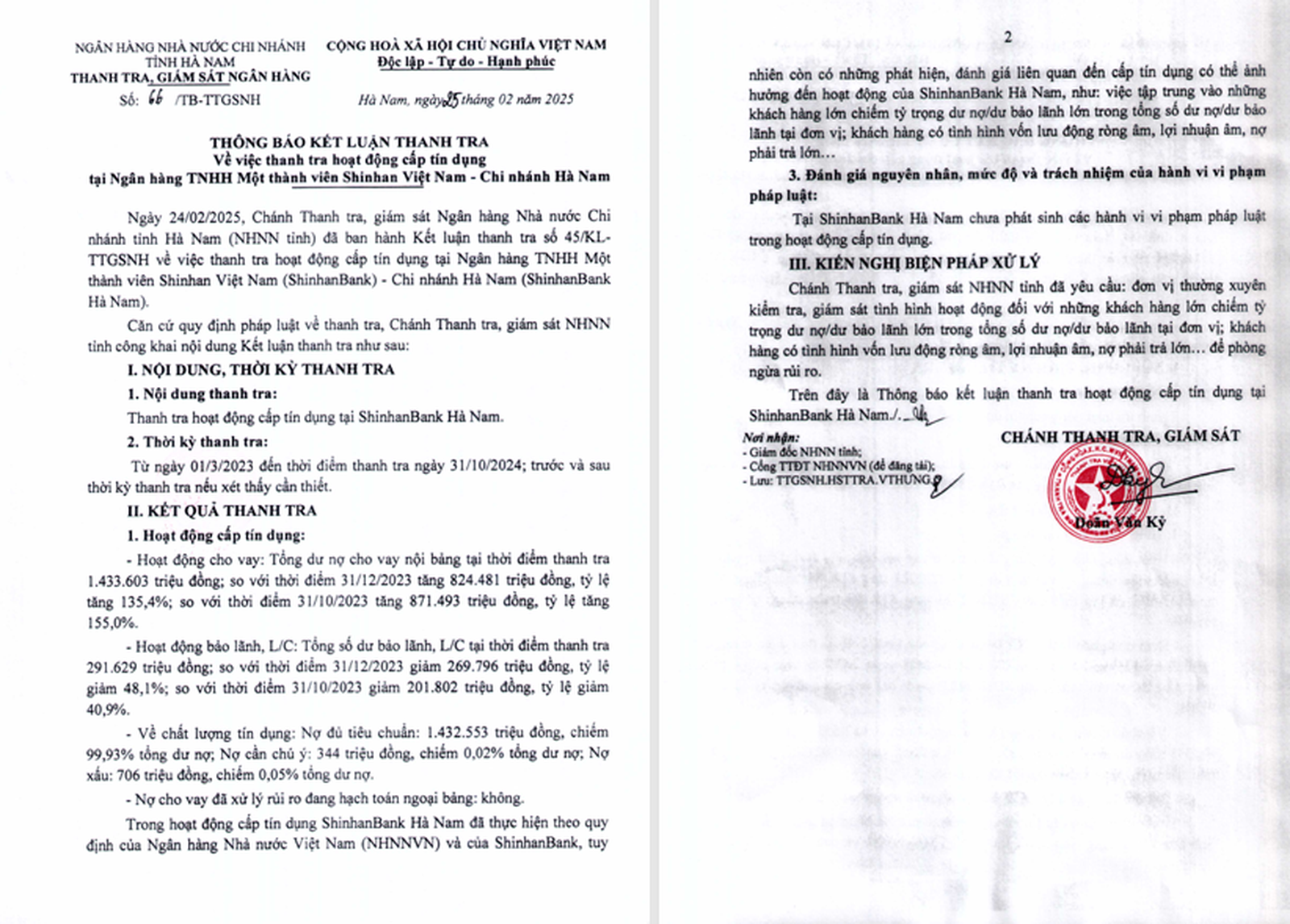 Mới đây, Ngân hàng Nhà nước đã công khai thông báo kết luận thanh tra, về việc thanh tra hoạt động cấp tín dụng tại Ngân hàng TNHH Một thành viên Shinhan Việt Nam - Chi nhánh Hà Nam (Shinhan Bank Hà Nam), thời kỳ thanh tra từ ngày 1/3/2023 đến 31/10/2024, và Ngân hàng TNHH Một thành viên Shinhan Việt Nam - Chi nhánh Biên Hoà (Shinhan Bank Biên Hoà).