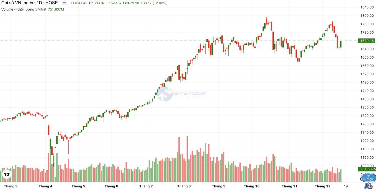 Bước sang phiên chiều, dòng tiền bắt đáy nhập cuộc mạnh mẽ, giúp thị trường hồi phục rõ nét. Thanh khoản tăng dần cùng đà hồi phục của giá cho thấy tâm lý nhà đầu tư đã ổn định hơn so với những phiên giảm điểm trước đó. Kết thúc phiên giao dịch, VN-Index tăng 33,17 điểm, lên mức 1.679,18 điểm.