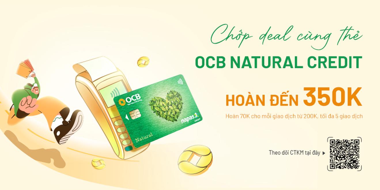 Nội dung ưu đãi: Tận hưởng ưu đãi hoàn tiền 70.000 VND cho mỗi giao dịch chi tiêu từ 200.000 VND bằng thẻ tín dụng nội địa OCB Natural, tối đa lên đến 350.000 VND/ chủ thẻ.