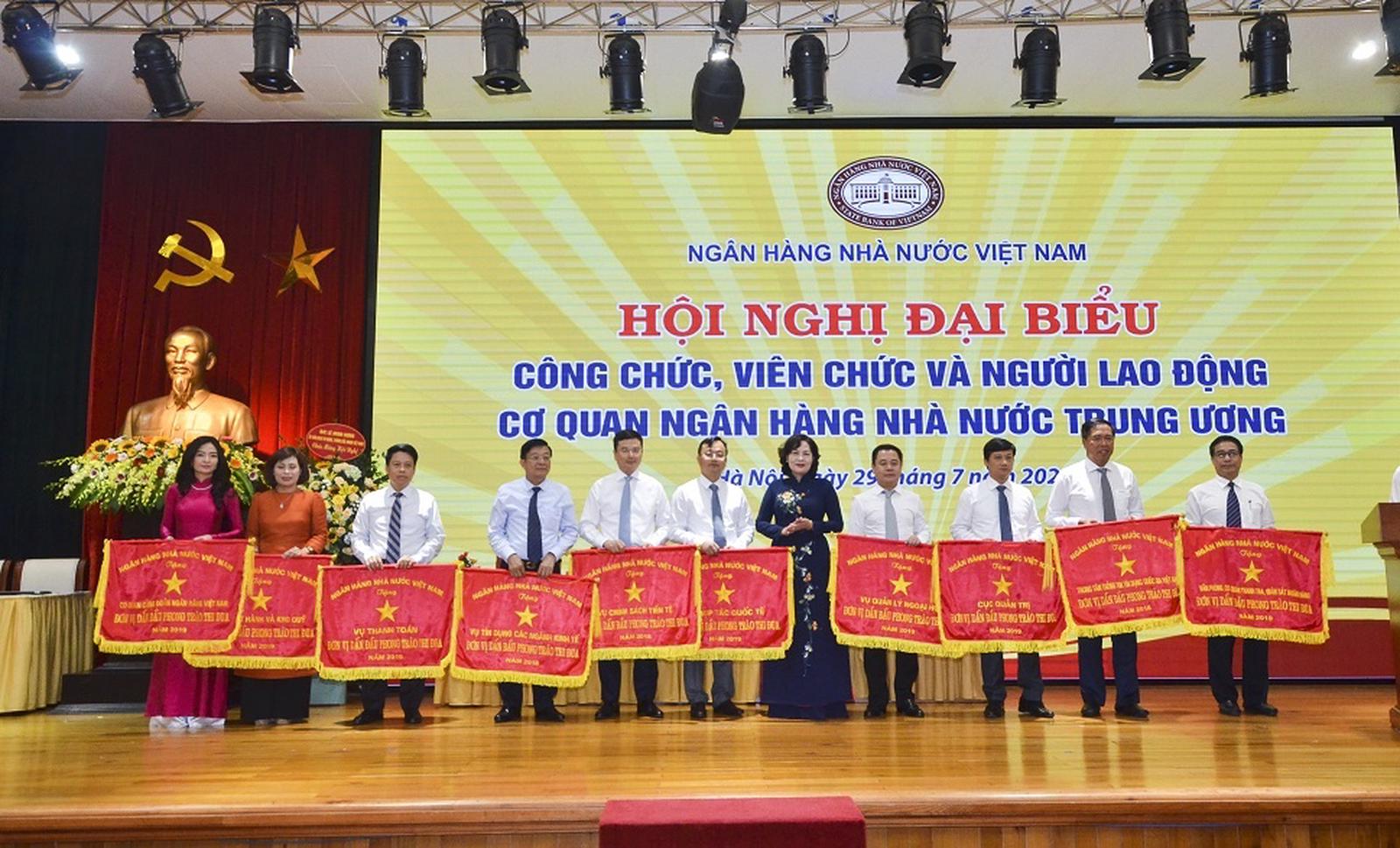 Phó Thống đốc NHNN Nguyễn Thị Hồng trao tặng Cờ thi đua của NHNN Việt Nam cho các đơn vị (Ảnh - CĐNHVN)