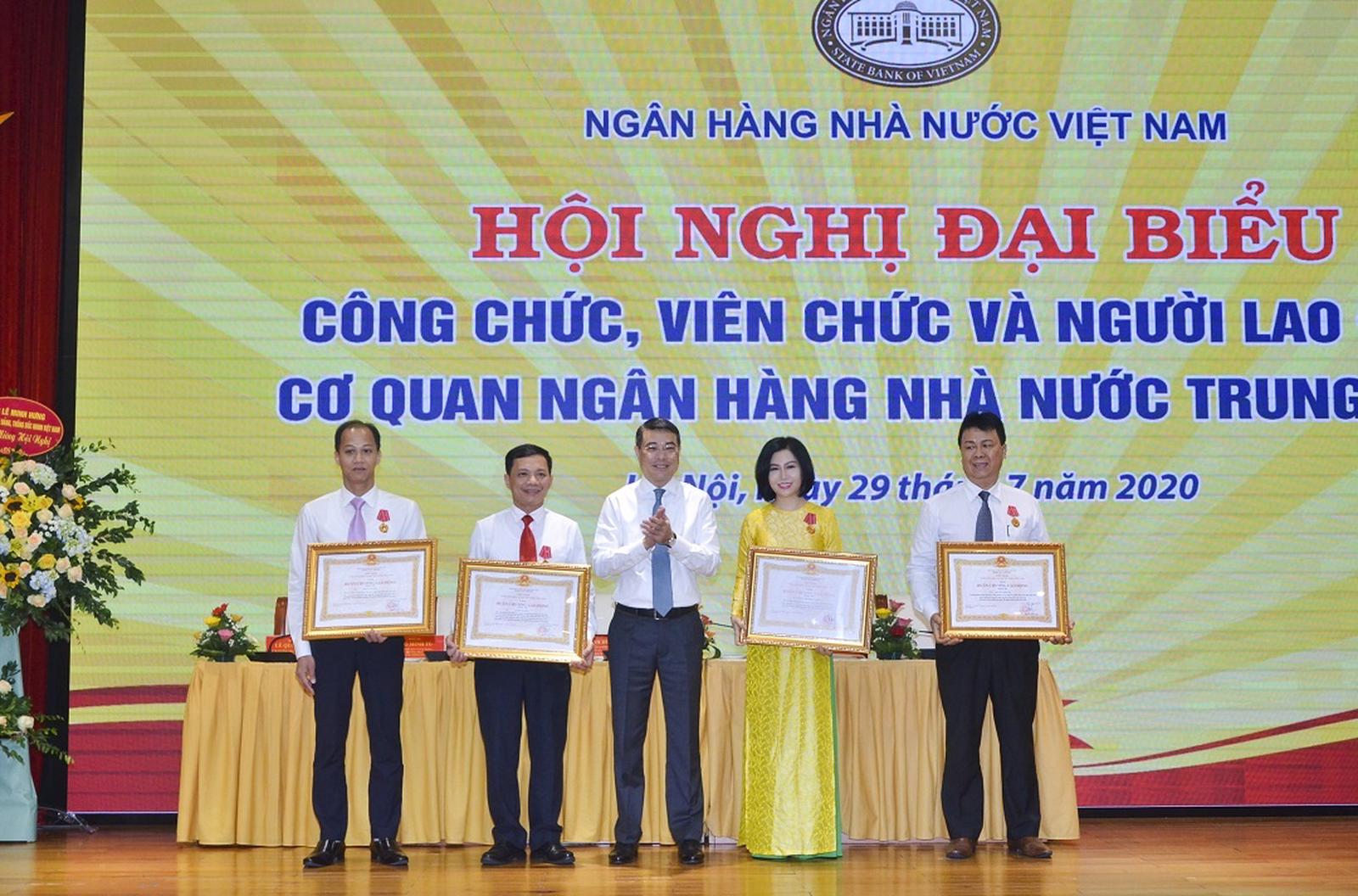 Thống đốc NHNN Lê Minh Hưng trao tặng Huân chương Lao động cho lãnh đạo các vụ, cục (Ảnh - CĐNHVN)
