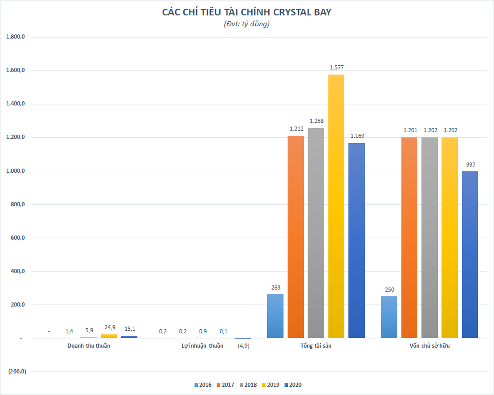 Quy mô tổng tài sản cũng theo đó giảm hơn 400 tỷ đồng xuống còn 1.169 tỷ đồng vào cuối năm 2020. Trước đó, trong năm ghi nhận doanh thu cao nhất kể từ khi hoạt động 2019, tổng tài sản của Crystal Bay cũng tăng 25% so với cuối năm 2018 lên 1.577 tỷ đồng.