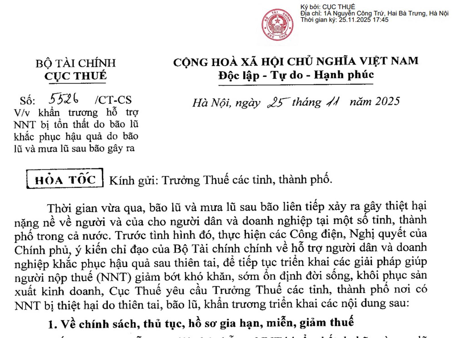 Tại Công văn số 5526/CT-CS ngày 25/11/2025 hỏa tốc gửi Trưởng Thuế các tỉnh, thành phố, Cục Thuế yêu cầu khẩn trương hỗ trợ người nộp thuế bị tổn thất do bão lũ khắc phục hậu quả do bão lũ và mưa lũ sau bão gây ra.