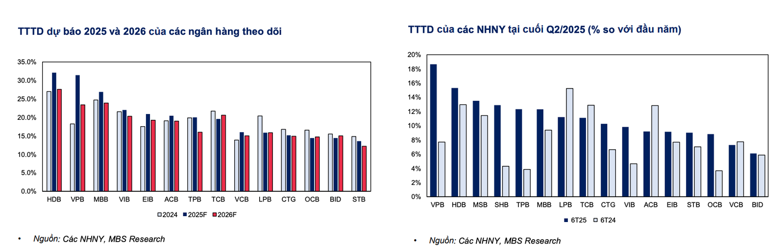 MBS kỳ vọng hầu hết các ngân hàng sẽ đạt được mục tiêu tăng trưởng tín dụng trong năm 2025, mặc dù chịu áp lực suy giảm NIM. Các ngân hàng có những đặc điểm sau đây nhiều khả năng sẽ ghi nhận mức tăng trưởng tín dụng mạnh mẽ hơn trong nửa cuối năm 2025: Tỷ trọng dư nợ cho vay tập trung nhiều vào các dự án đầu tư công và cho vay doanh nghiệp nhỏ và vừa (SME), là những lĩnh vực được hưởng lợi từ chính sách hỗ trợ tích cực.