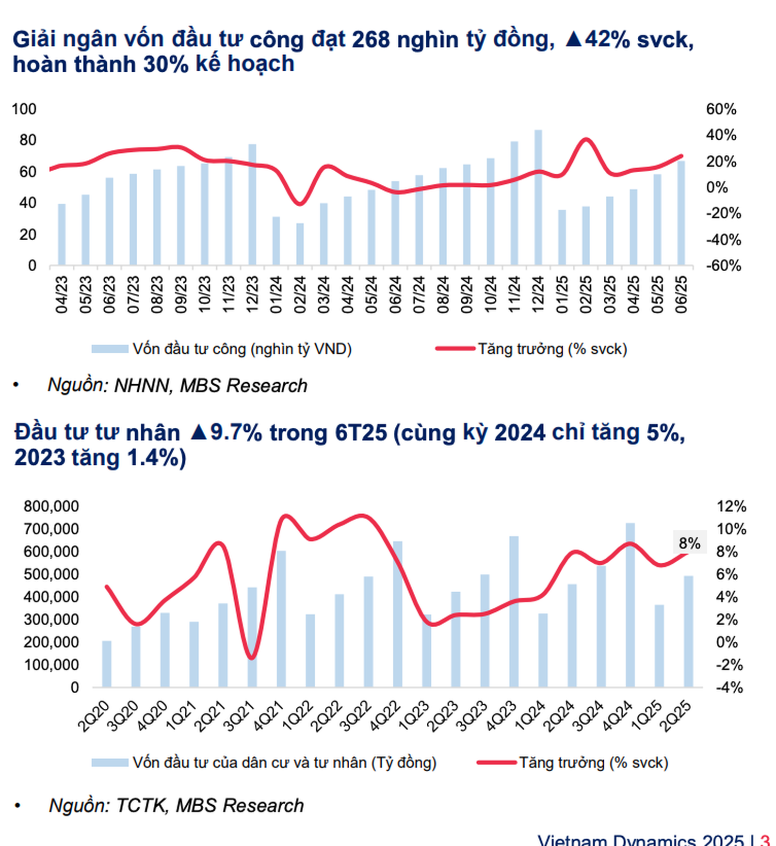 Trong đó, đối với đẩy mạnh đầu tư công, theo số liệu thực tế 6 tháng đầu năm 2025 còn thấp so với kế hoạch. Tính đến hết 6 tháng đầu năm 2025, giải ngân đầu tư công đạt 268 nghìn tỷ đồng, tăng 42,3% so với cùng kỳ 2024 nhưng mới chỉ hoàn thành 29,6% kế hoạch cả năm. Do đó, MBS kỳ vọng tiến độ giải ngân sẽ được tăng tốc trong phần còn lại của năm 2025, qua đó trở thành yếu tố then chốt để đạt mục tiêu tăng trưởng GDP 8%.