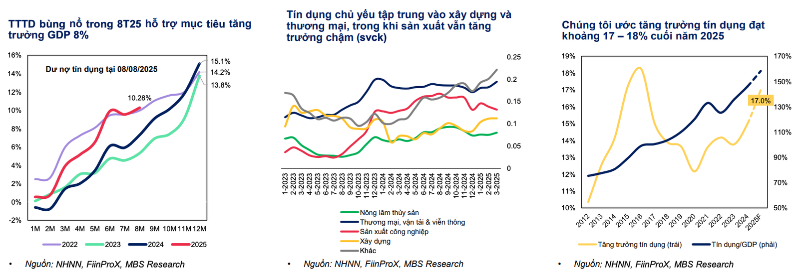 Theo MBS, tính đến 08/08/2025, tăng trưởng tín dụng (TTTD) toàn hệ thống ngân hàng đạt 10,28% so với đầu năm (YTD), vượt xa mức 5,84% YTD của cùng kỳ năm trước.