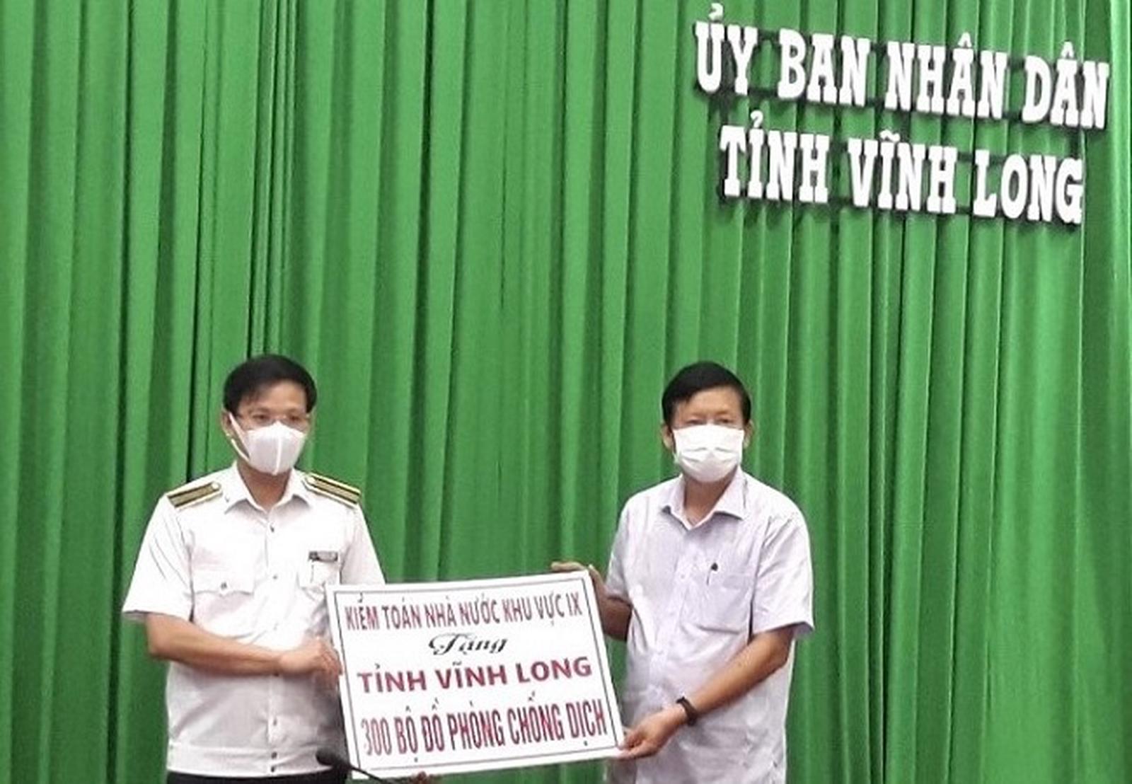 Chủ tịch Công đoàn cơ sở KTNN khu vực IX hỗ trợ tỉnh Vĩnh Long phòng, chống dịch Covid-19. Ảnh: TQ