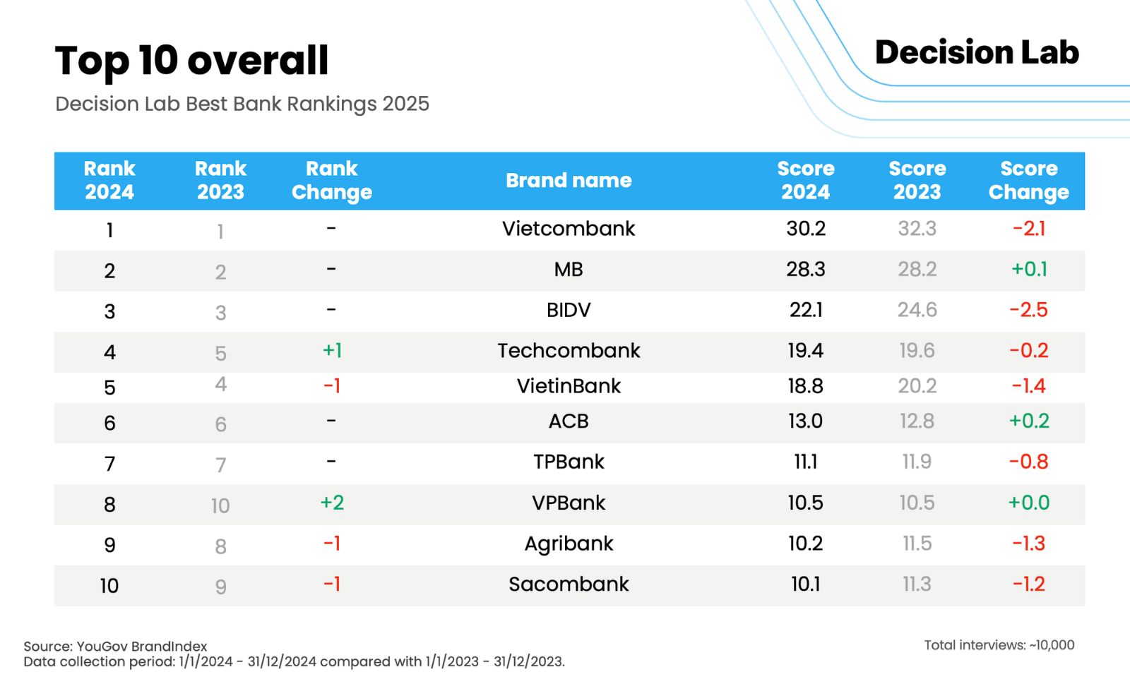 Về Decision Lab: Decision Lab, thành lập năm 2017 tại Canada, là tổ chức nghiên cứu chuyên sâu về khoa học hành vi. Decision Lab áp dụng các phương pháp khoa học và công nghệ để hỗ trợ các tổ chức đưa ra quyết định thông minh, giải quyết vấn đề trong kinh doanh và xã hội. Bảng xếp hạng Ngân hàng Tốt nhất của Decision Lab hàng năm được xây dựng dựa trên chỉ số thương hiệu YouGov BrandIndex, một công cụ đo lường sức khỏe thương hiệu qua các yếu tố như Ấn tượng, Chất lượng, Giá trị, Hài lòng, Đề xuất và Danh tiếng. Các ngân hàng được xếp hạng dựa trên điểm số tổng hợp từ các yếu tố này, phản ánh mức độ nhận diện và tin tưởng của khách hàng vào ngân hàng. Bảng xếp hạng giúp đánh giá các ngân hàng hàng đầu và xu hướng cải thiện thương hiệu trong từng năm. Thông tin tham khảo thêm tại đây: https://www.decisionlab.co/best-bank-rankings-2025 |