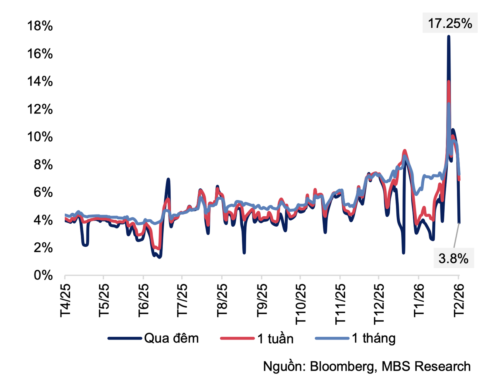 Theo MBS, diễn biến này chủ yếu do nhu cầu thanh toán dịp cận Tết tăng cao, các ngân hàng đẩy tín dụng sớm để bù cho giai đoạn nghỉ lễ, đồng thời trùng thời điểm doanh nghiệp thực hiện nghĩa vụ thuế khiến thanh khoản hệ thống thu hẹp.