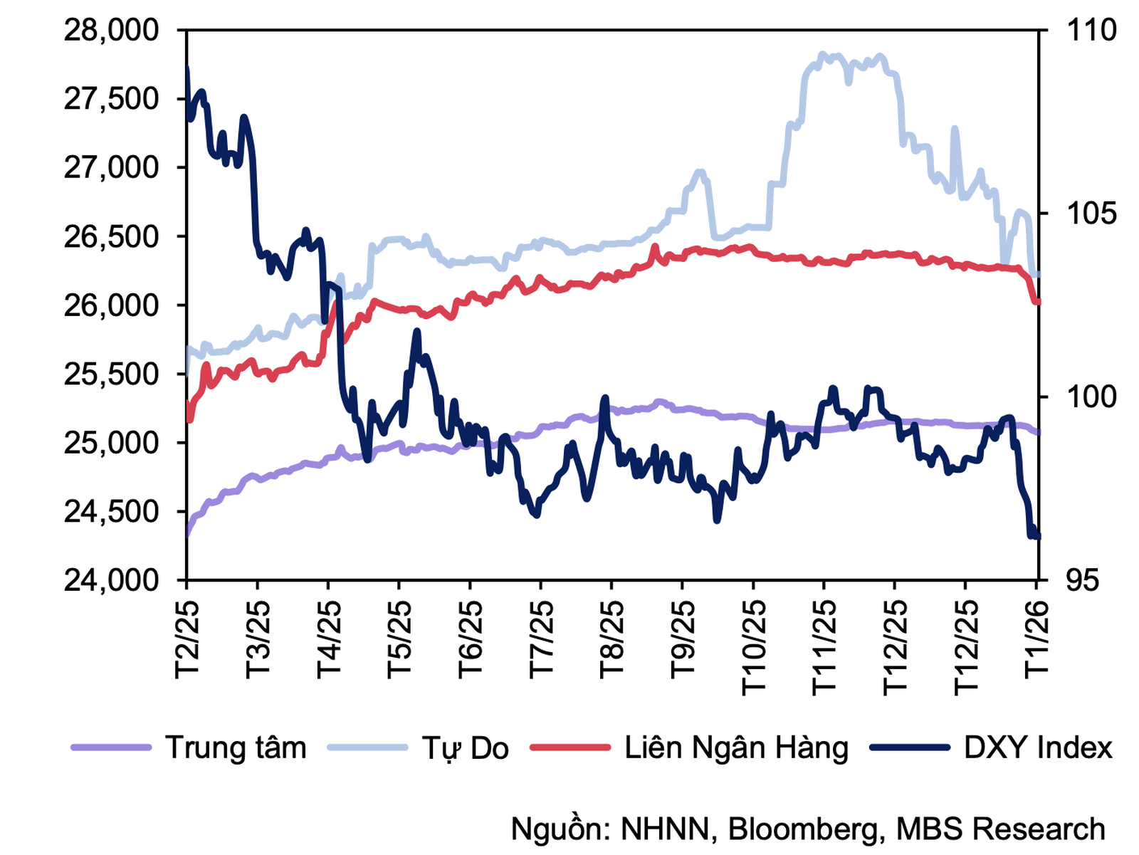 Báo cáo thị trường tiền tệ mới công bố của Công ty Cổ phần Chứng khoán MB (MBS) cho thấy tỷ giá USD/VND khởi đầu năm theo hướng hạ nhiệt, trái với áp lực tăng kéo dài trong nhiều tháng trước đó. Diễn biến này gắn liền với xu hướng suy yếu của đồng USD trên thị trường quốc tế, khi kỳ vọng chính sách tiền tệ toàn cầu có sự điều chỉnh và mức độ bất định vĩ mô gia tăng.