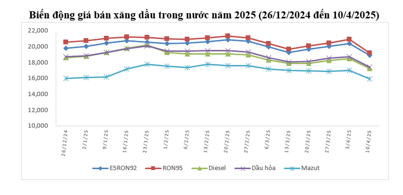 Dầu diesel 0.05S có giá mới 17.243 đồng/lít, giảm 1.235 đồng/lít. Dầu hỏa có giá mới 17.413 đồng/lít, giảm 1.322 đồng/lít so với giá hiện hành; dầu mazut 180CST 3,5S được điều chỉnh ở mức 15.902 đồng/kg, giảm 1.124 đồng/kg.