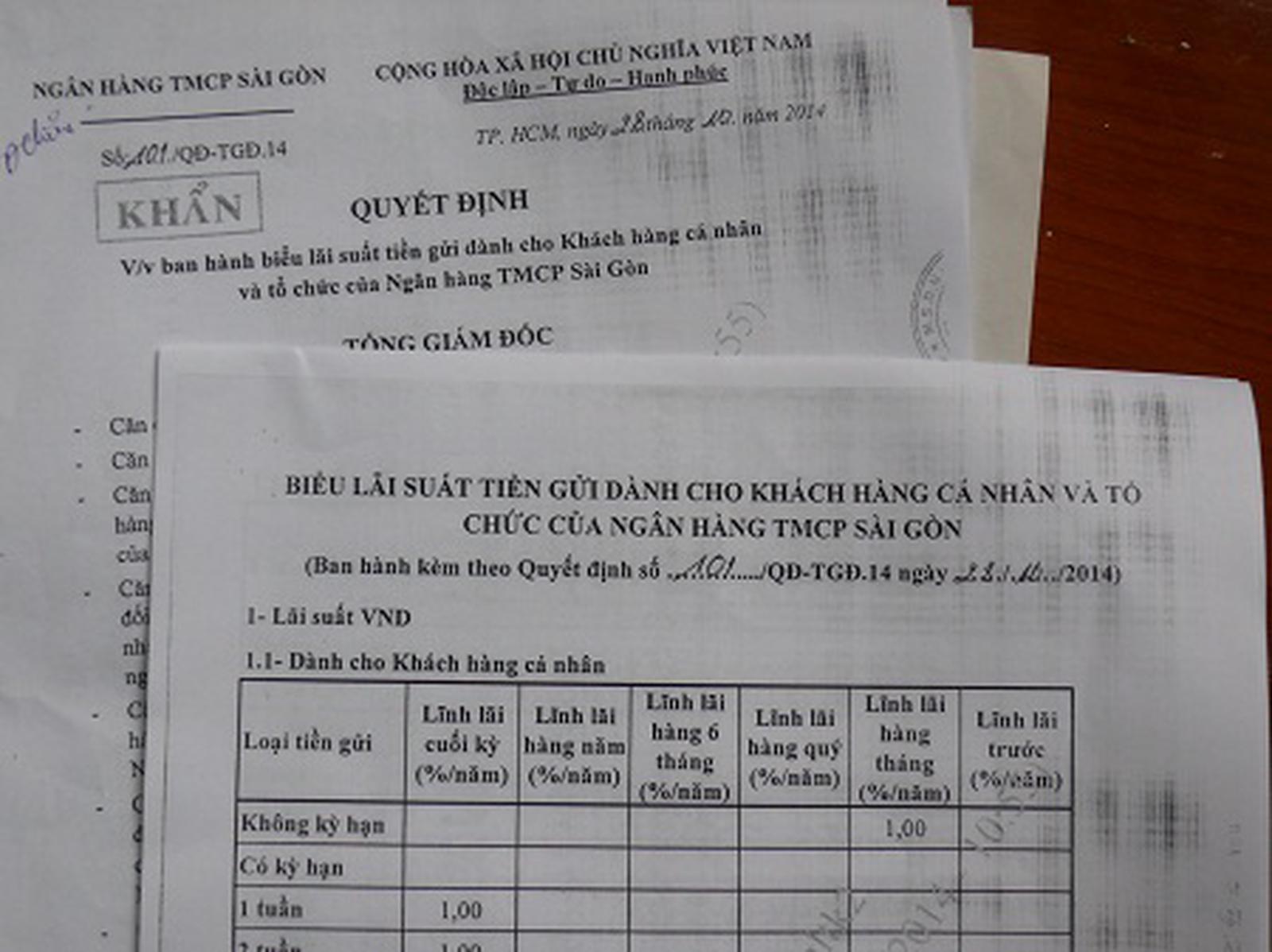 Quyết định được đánh dấu “khẩn” của Ngân hàng Thương mại Cổ phần Sài Gòn gửi các chi nhánh về việc điều chỉnh giảm lãi suất. Ảnh: Thế Lữ