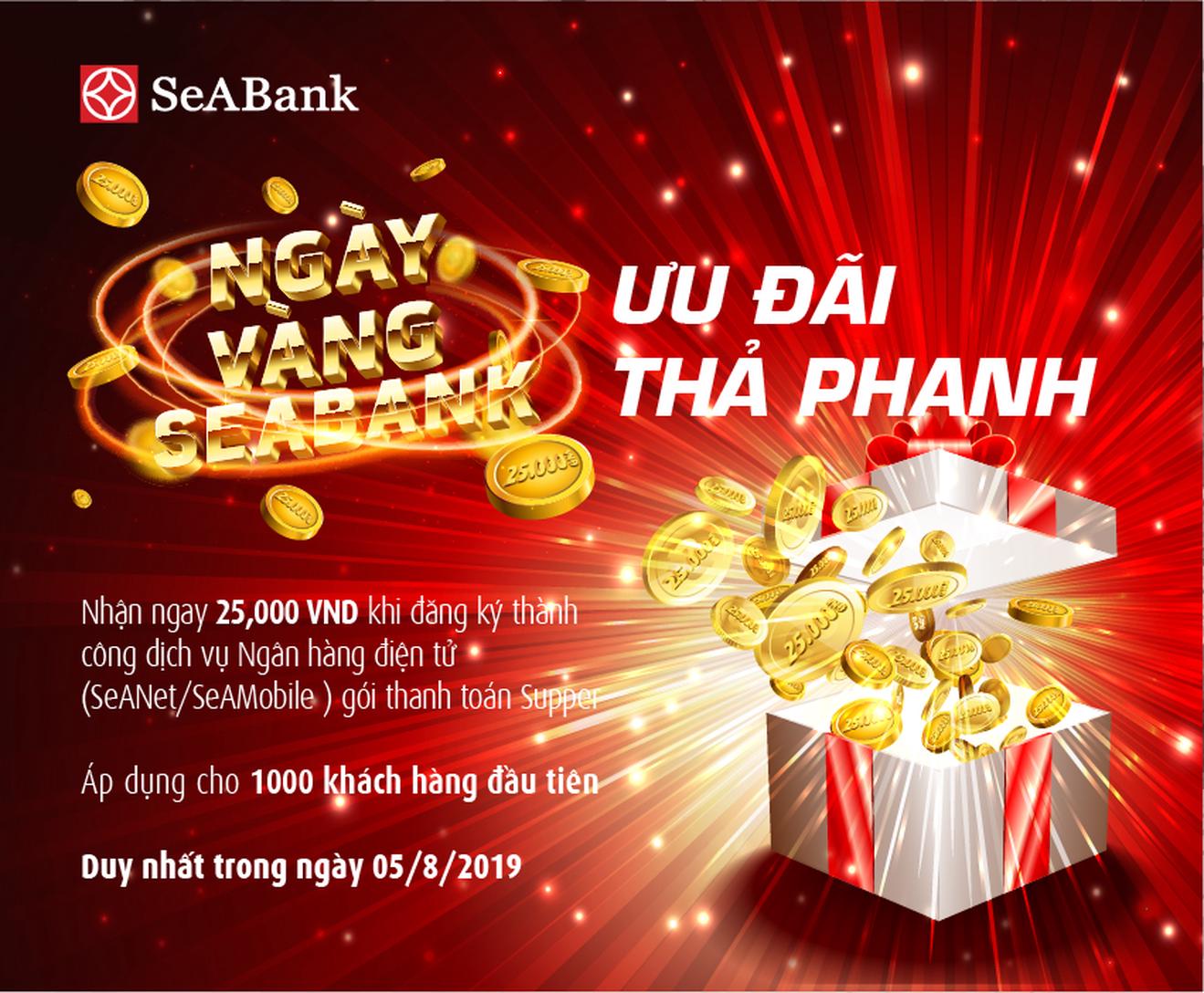 Với mong muốn giúp khách hàng thanh toán nhanh chóng, tiện lợi và tăng thêm giá trị gia tăng cho khách hàng, SeABank đã triển khai chương trình khuyến mại “Ngày vàng SeABank, ưu đãi thả phanh”. Theo đó, duy nhất trong ngày 5/8/2019, 1.000 khách hàng đầu tiên mở mới tài khoản thanh toán tại SeABank và đăng ký thành công dịch vụ SeANet/ SeAMobile gói Supper sẽ nhận một phần quà trị giá 25.000 đồng. Quà tặng được chuyển vào tài khoản của khách hàng sau khi kết thúc chương trình.